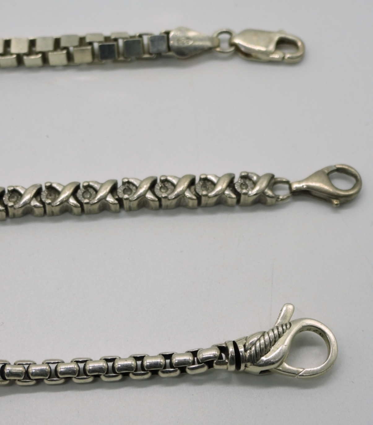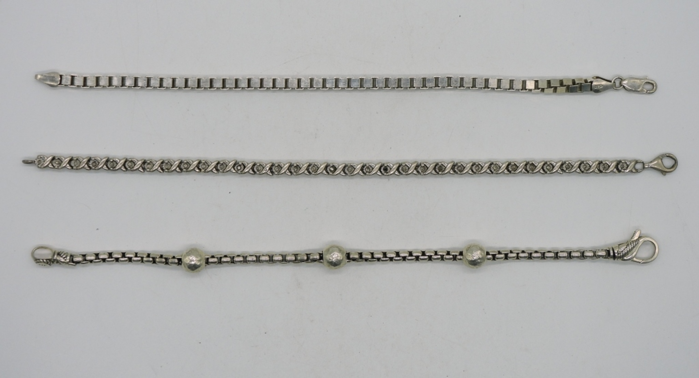 Three sterling silver chain bracelets, 7.5-8″. (29.3 dwt)