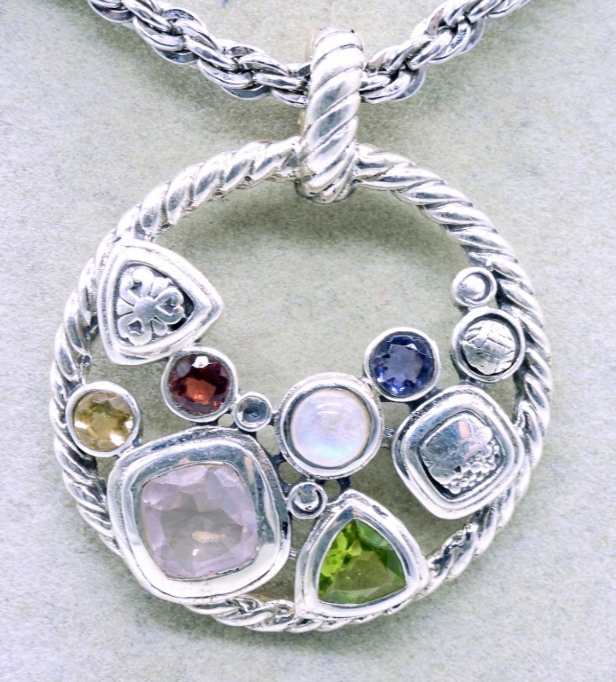 Round sterling, mixed gemstone pendant on a 24″ sterling chain. (27.4 dwt)