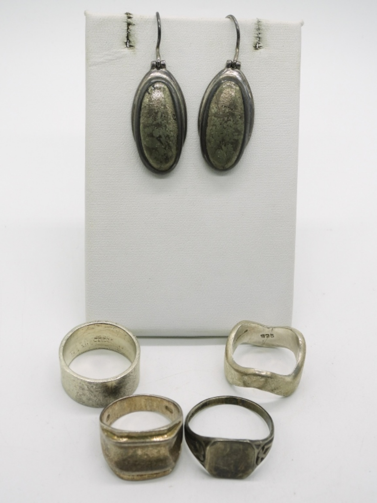 Four sterling rings, sizes 7.5-11.5. Heavy sterling pierced earrings, 1.5″ long. (29.7 dwt)