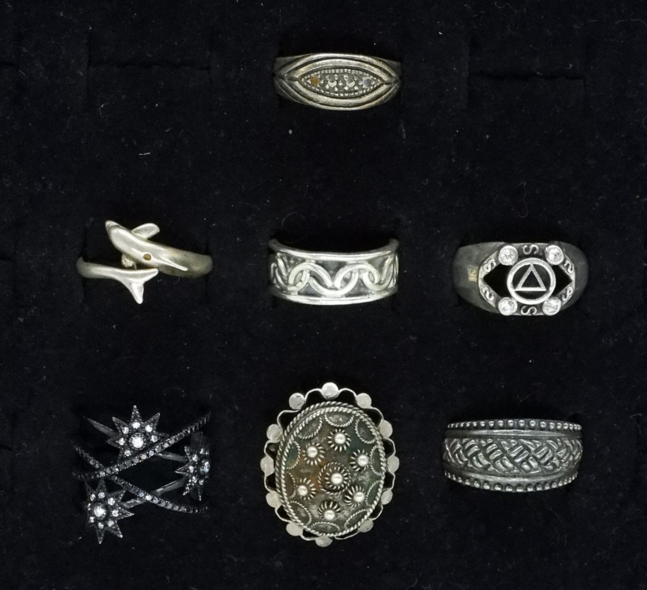Seven sterling fashion rings. Sizes 3-9 (24.3 dwt)