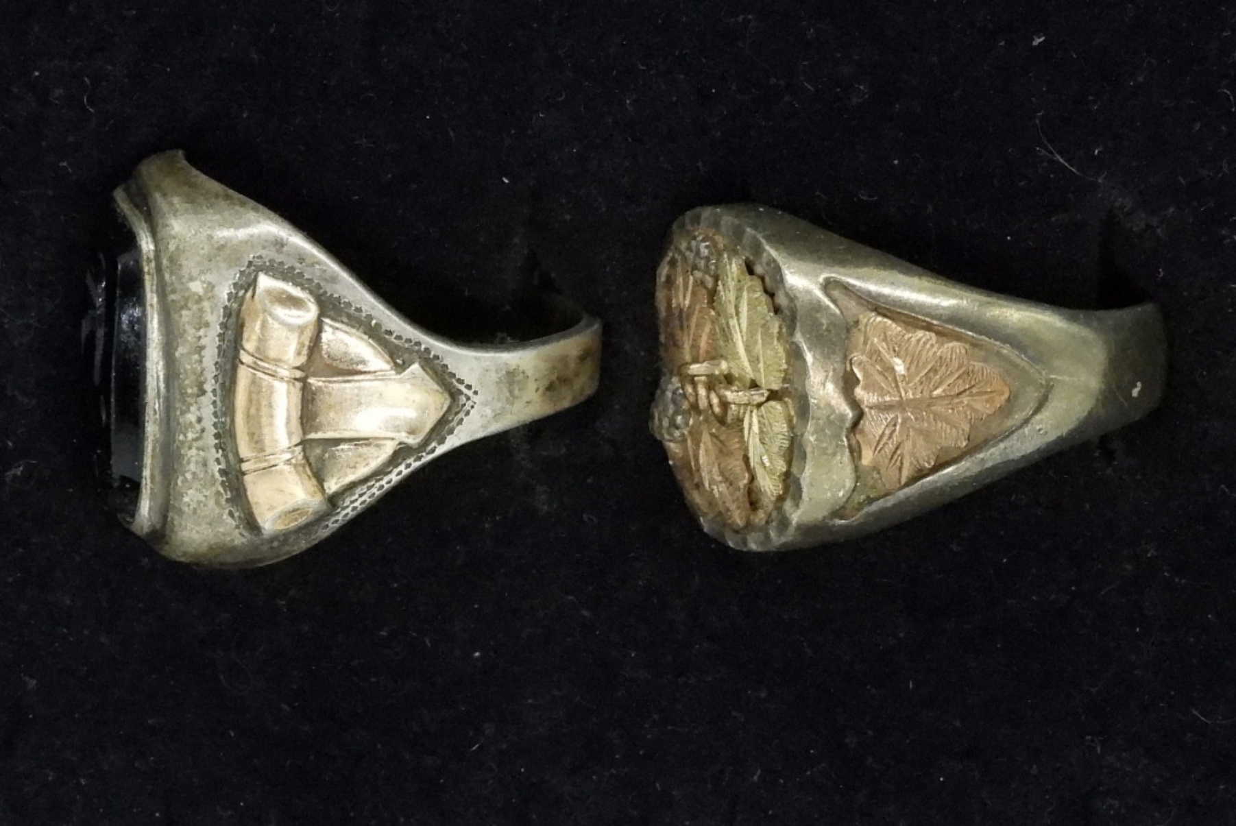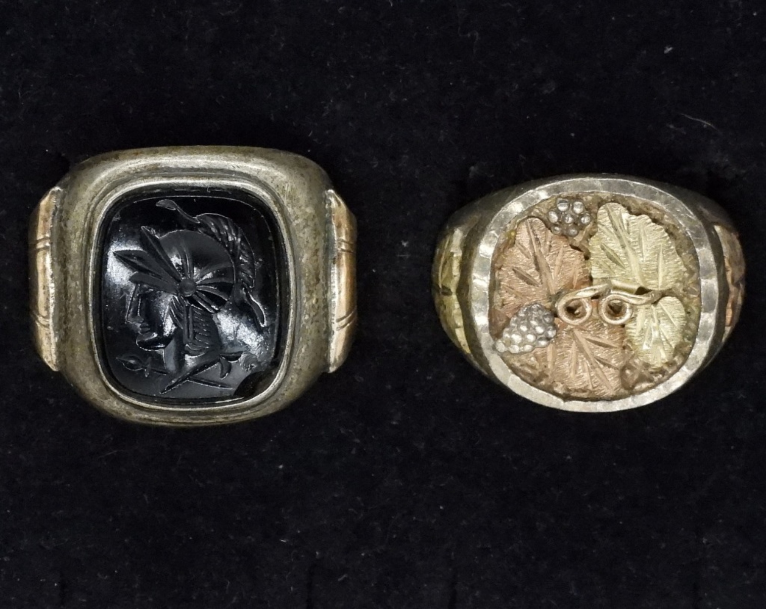 Two sterling men’s rings. Black onyx roman soldier ring, size 10. Sterling 10k gold ring, size 9. (13 dwt)