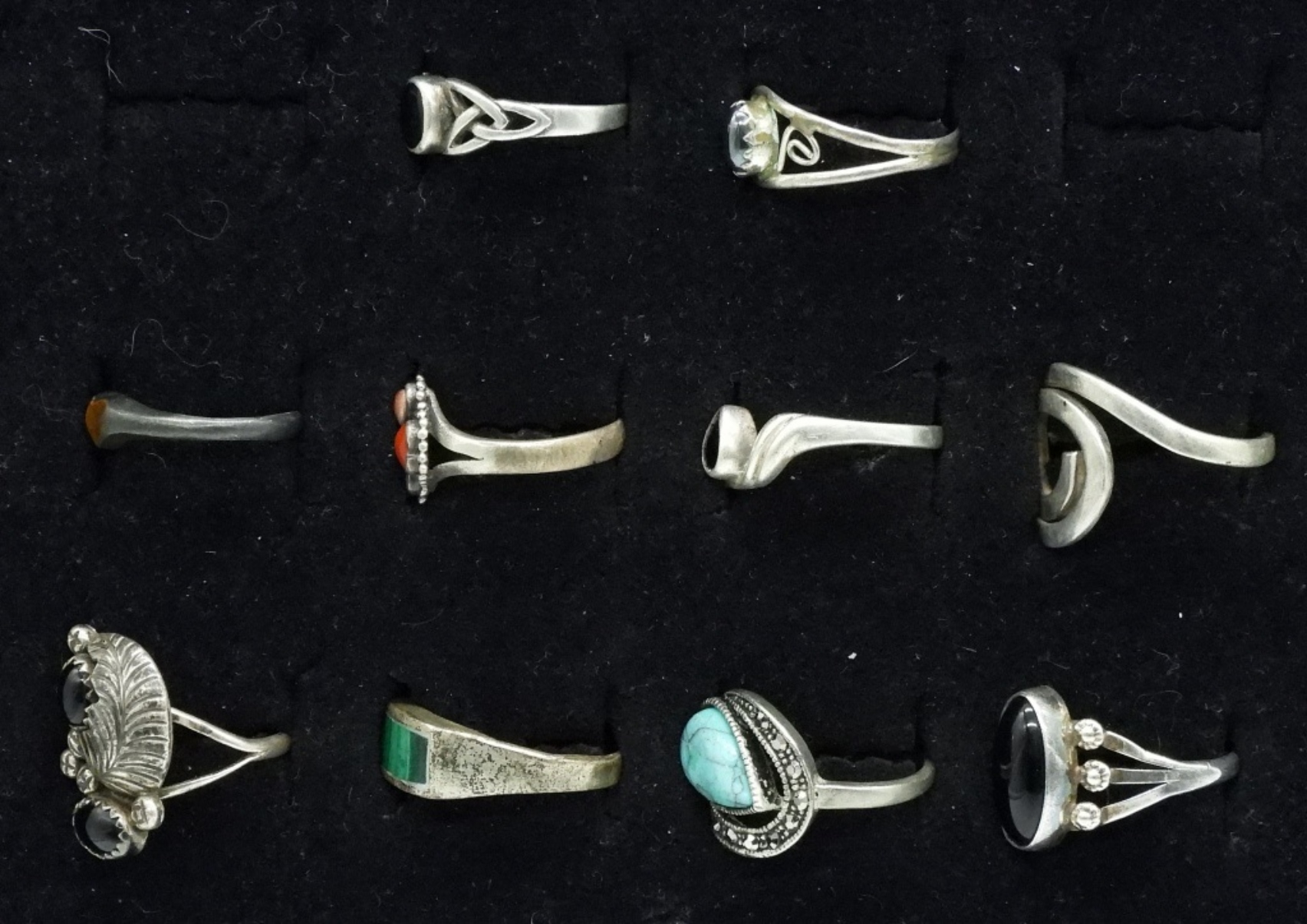 Ten sterling rings with black onyx & turquoise gemstones. Sizes 5.5-9 (17.3 dwt)