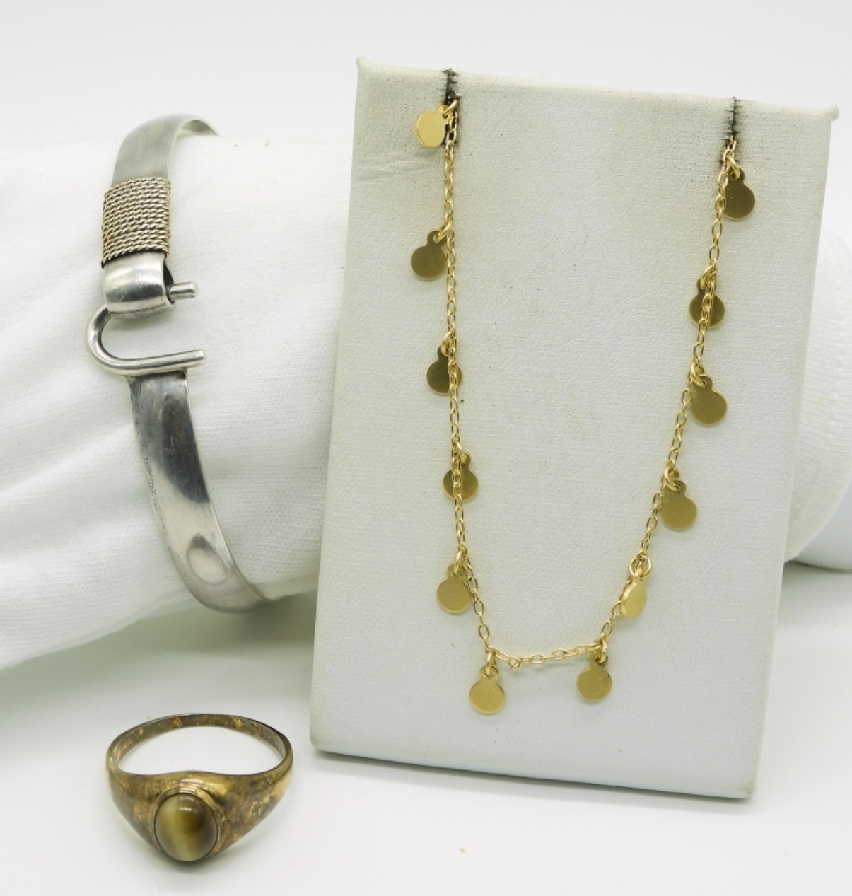 Sterling bracelet with gold tone accents. Gold tone sterling cats eye ring, size 13. Petite sterling gold tone necklace, 18″. (21.9 dwt)