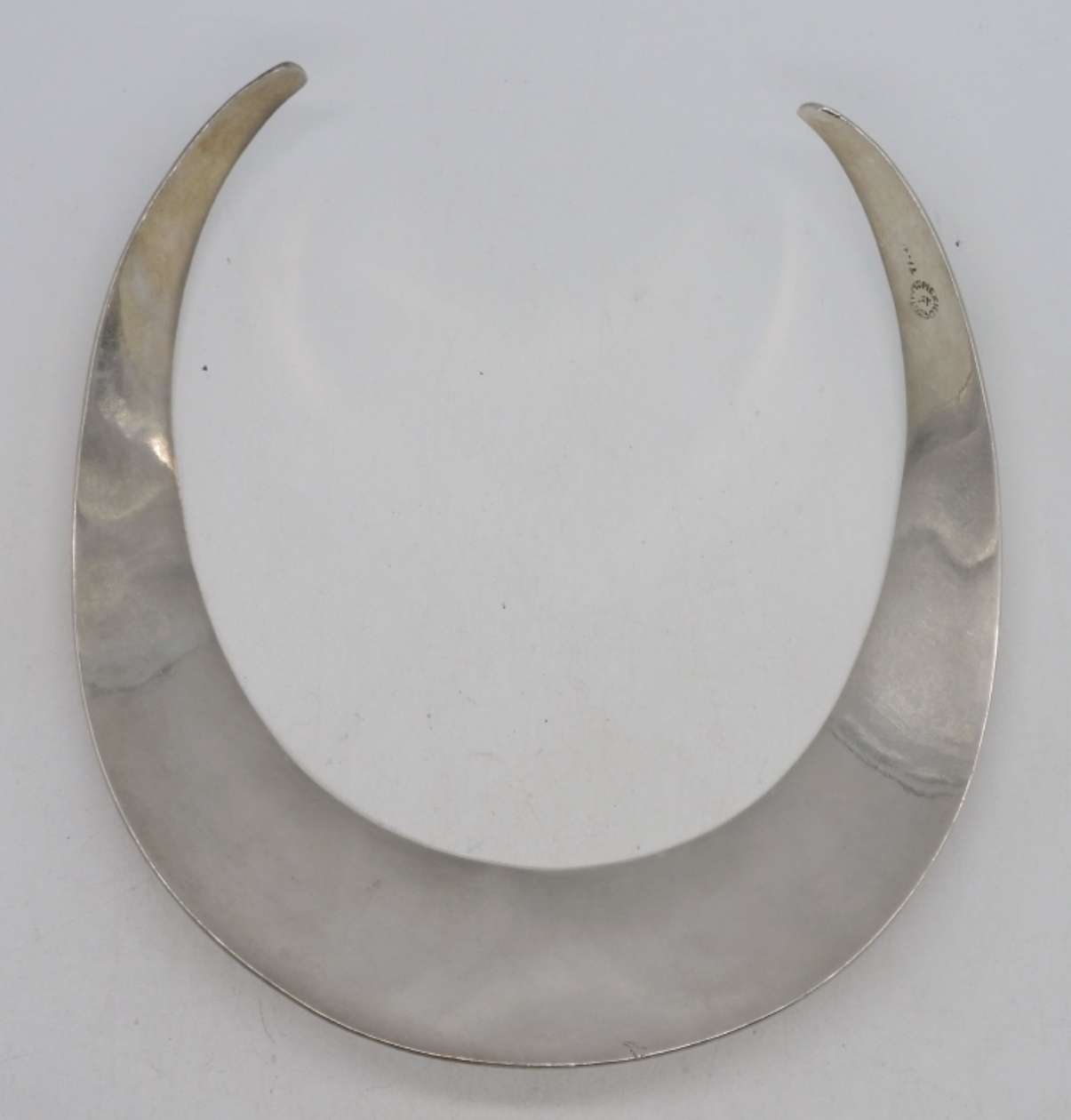 Sterling Taxco, Mexico Collar Style Necklace. Solid piece of silver, wide 6″ from front to back. Marked “TP-?? Taxco Mexico 925”. Stamp is hard to read.