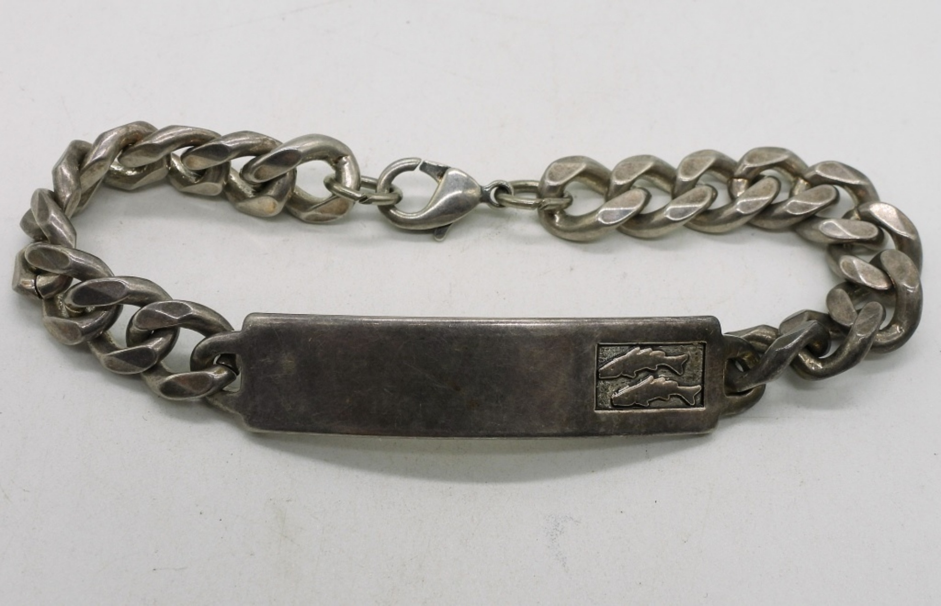 Vintage sterling ID bracelet, not engraved. With two fish on it. 8″. (22.6 dwt)