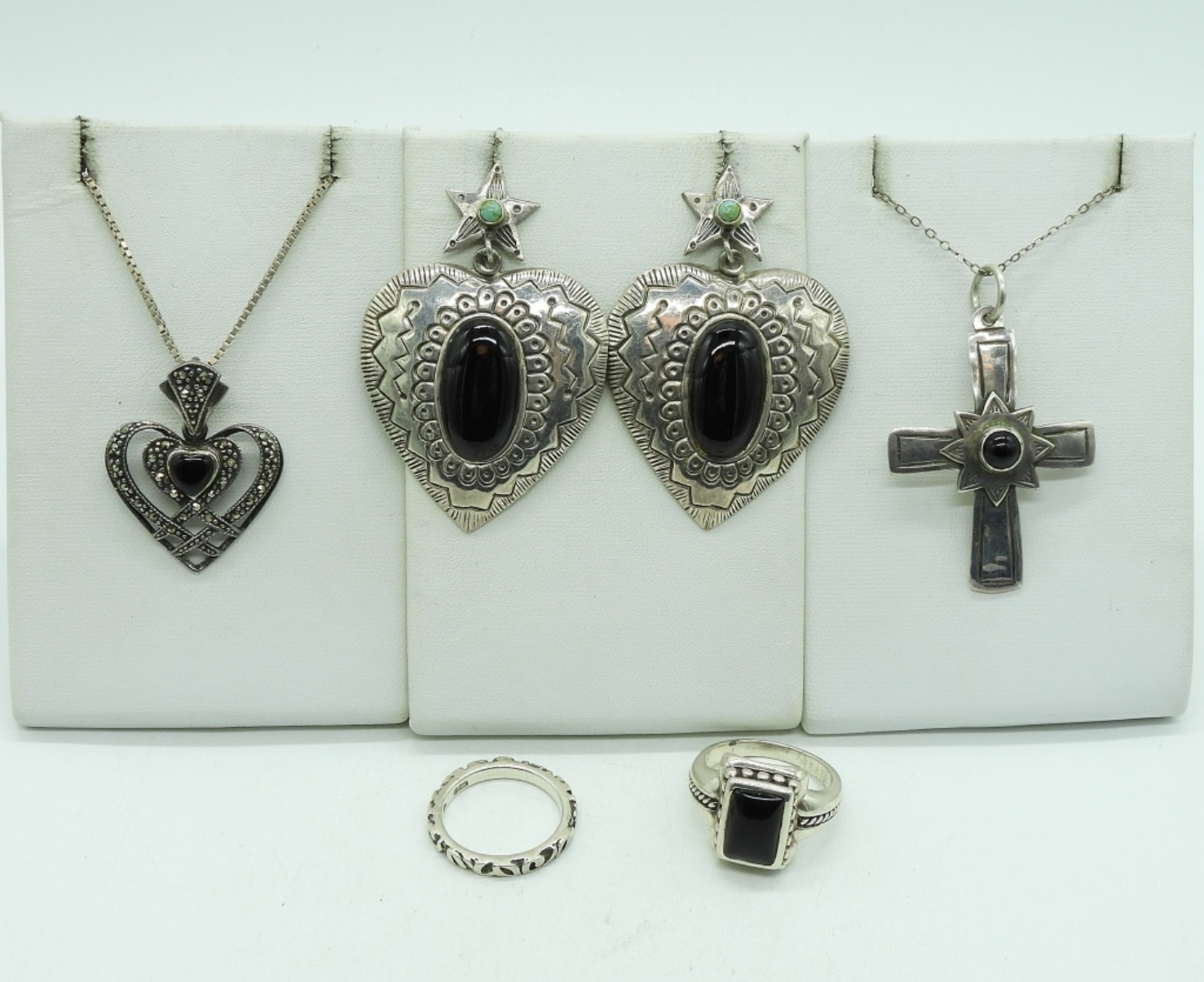 Two sterling black onyx pendants, two sterling chains 18″. 2″ pierced earrings. Two sterling rings, sizes 5.5 & 8.5 (24.1 dwt)