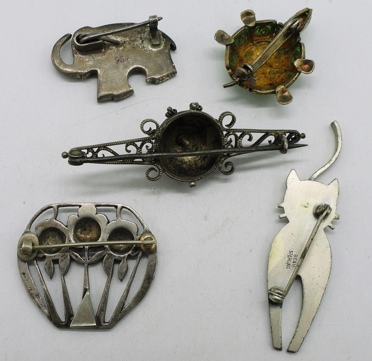 Five sterling vintage brooches, 1″ – 2.5″. (21.2 dwt)