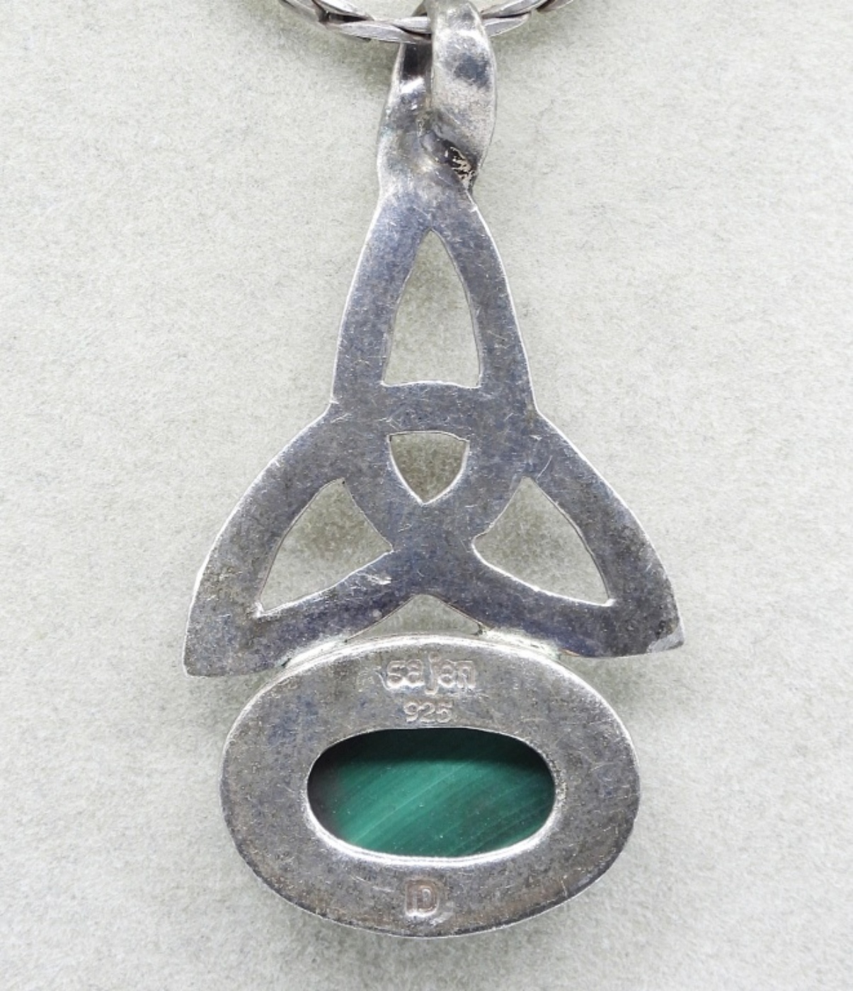 Malachite celtic knot necklace, 24″. (12 dwt)