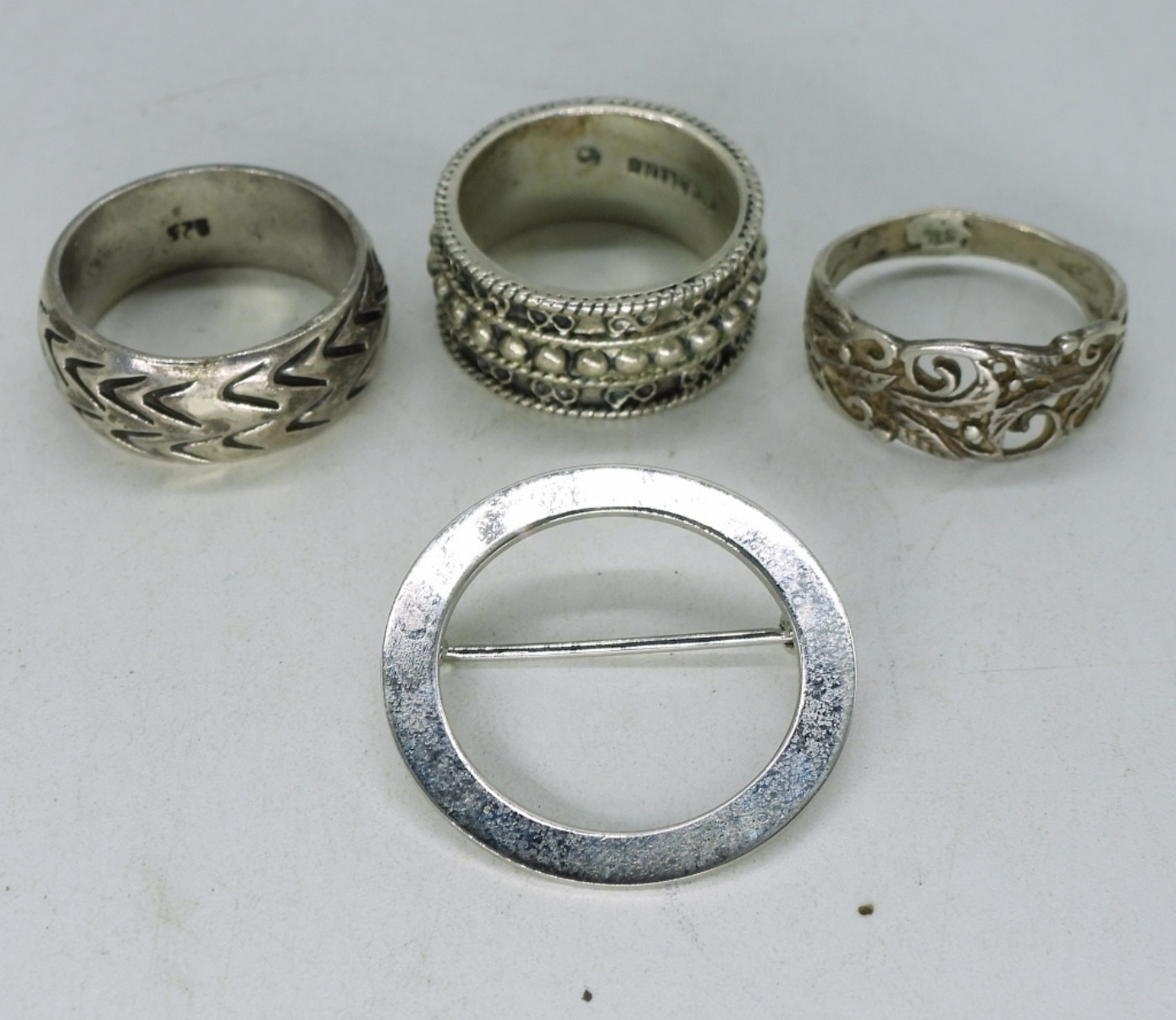 Three sterling fashion rings, sizes 6-7. Brooch is 1″. Necklace is 20″. (25.1 dwt)