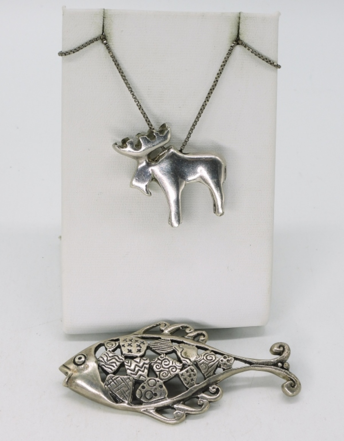 Heavy moose pendant (1″) on a 26″ chain. Fish pin, 2.5″. (20.7 dwt)