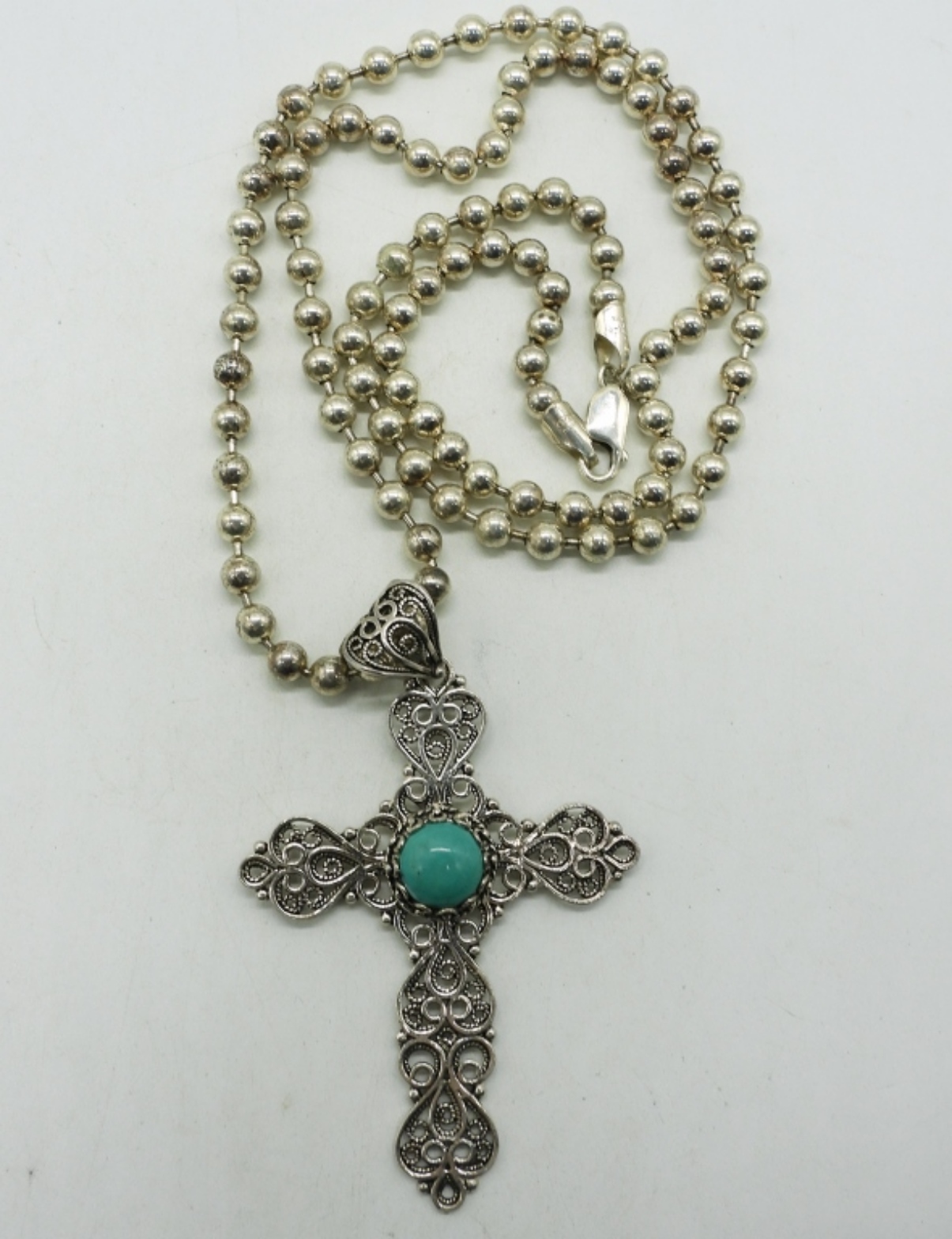 Sterling cross pendant marked “Turkey 925″, 3″. Milor sterling ball chain, 28”. (33.6 dwt)