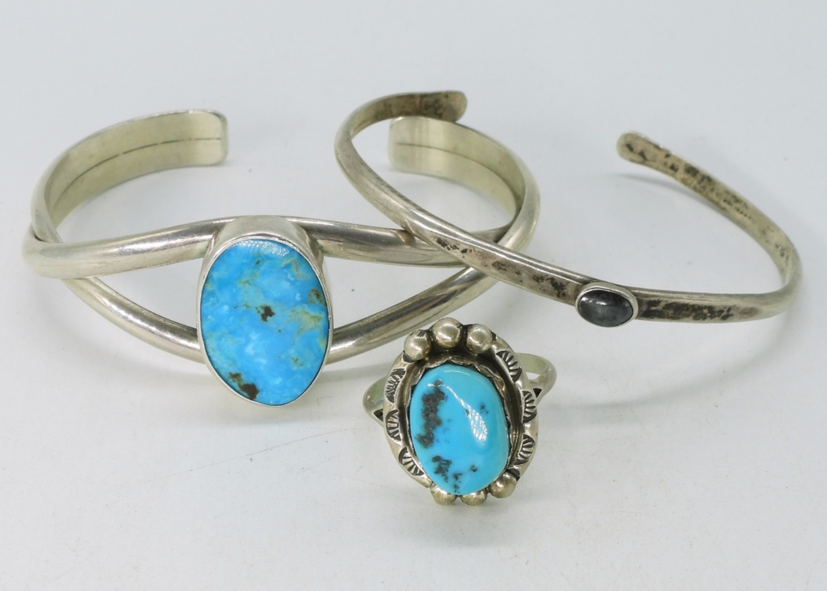 Two sterling cuff bracelets, turquoise and hematite, 7″. Sterling turquoise ring, size 8. (21 dwt)