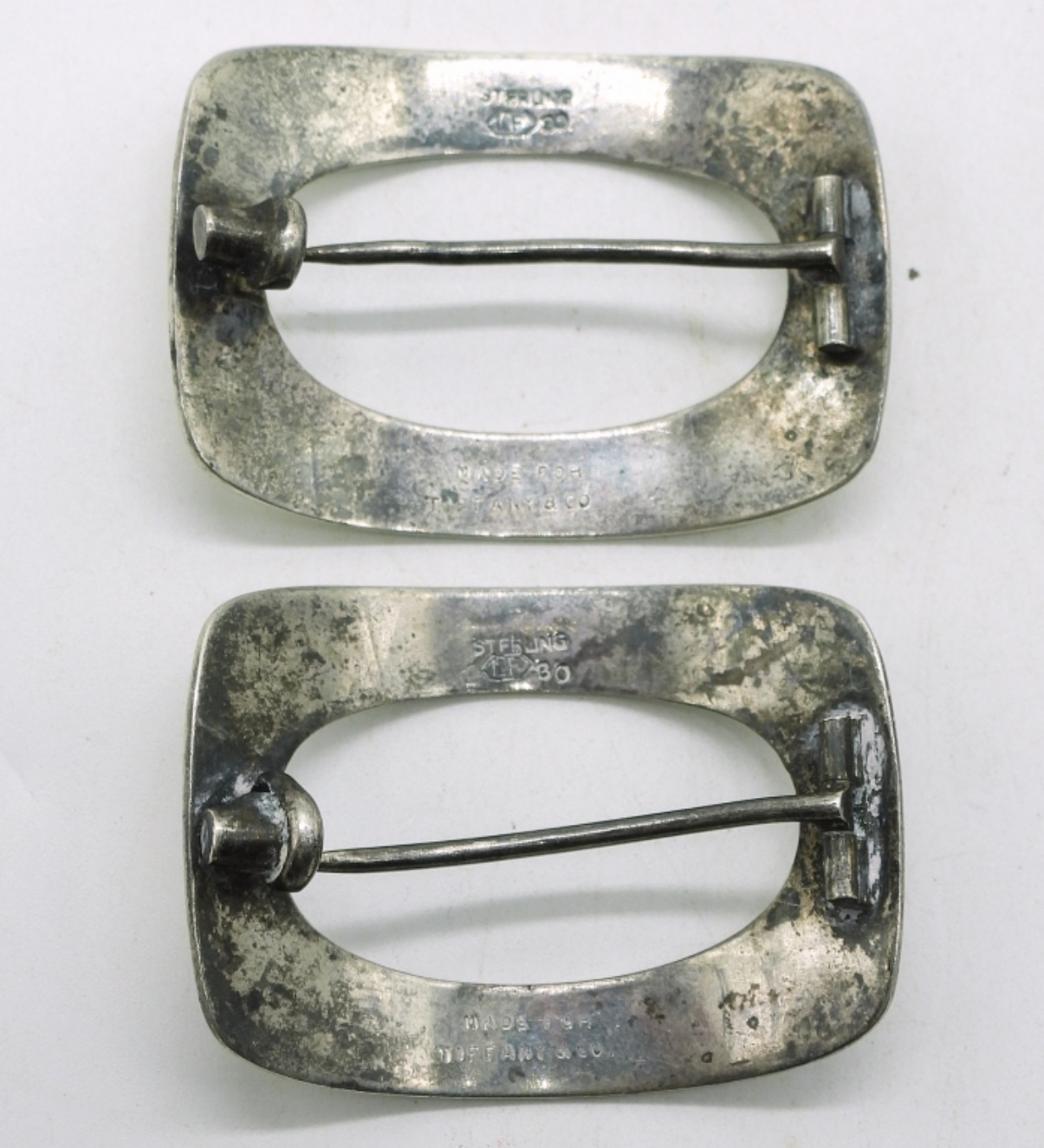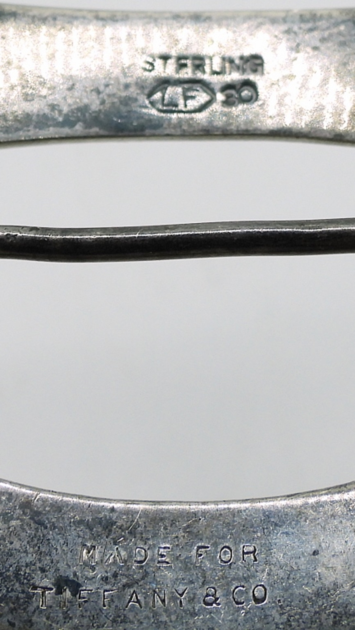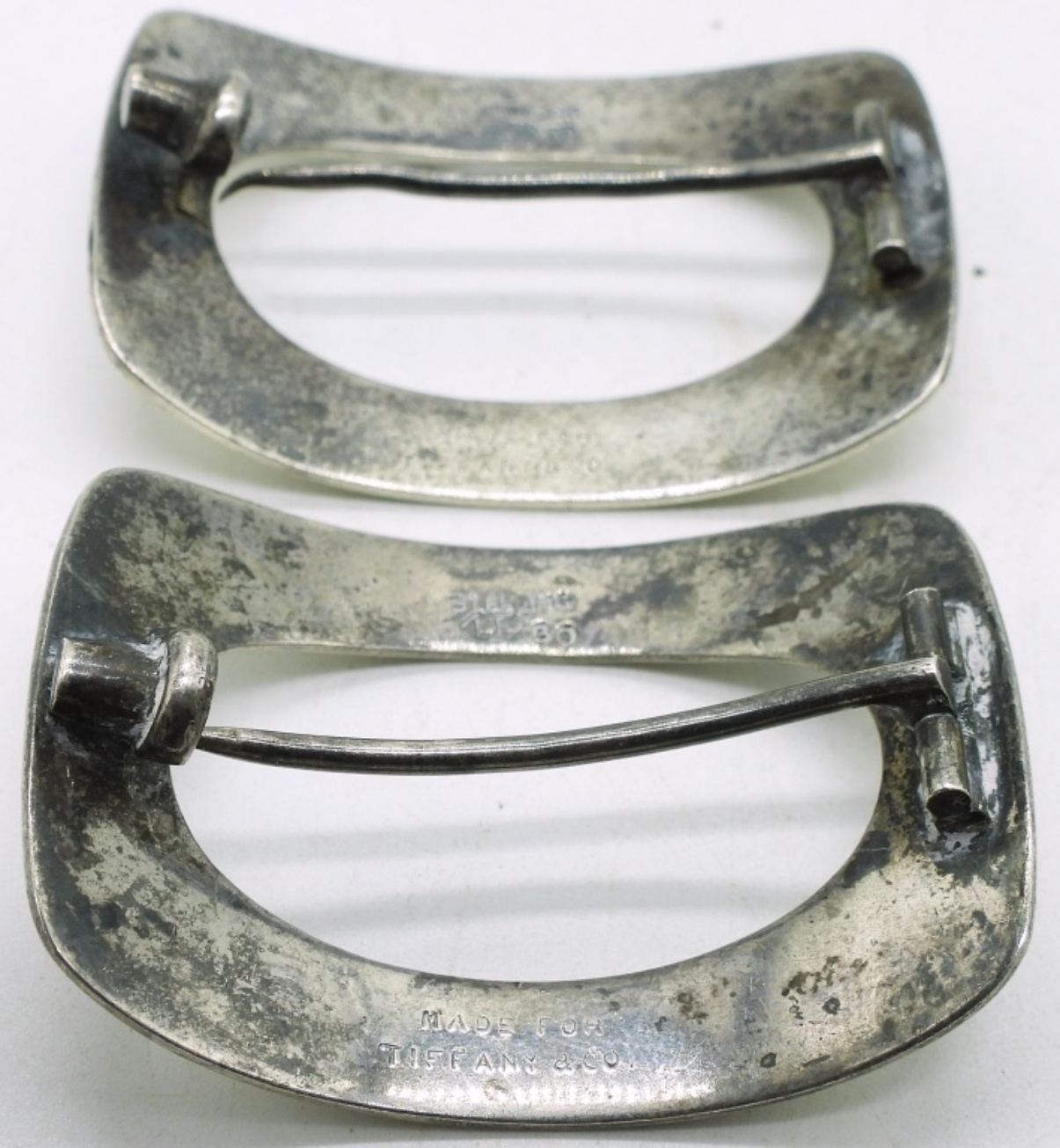 Two sterling brooches. Markings on the back say, “Sterling LF 30 – Made for Tiffany & Co”. 2″ x 1.5″. (14.1 dwt)