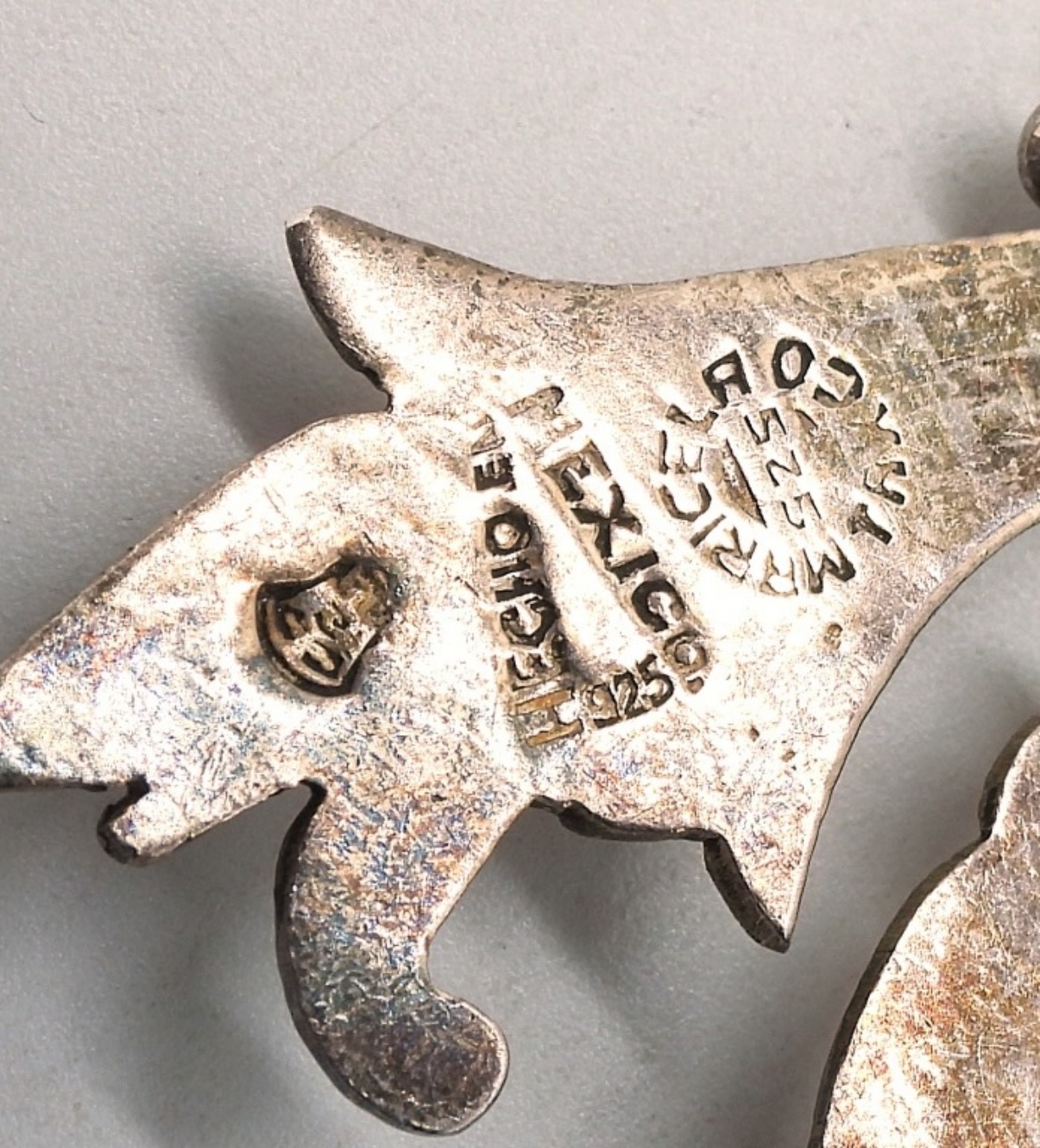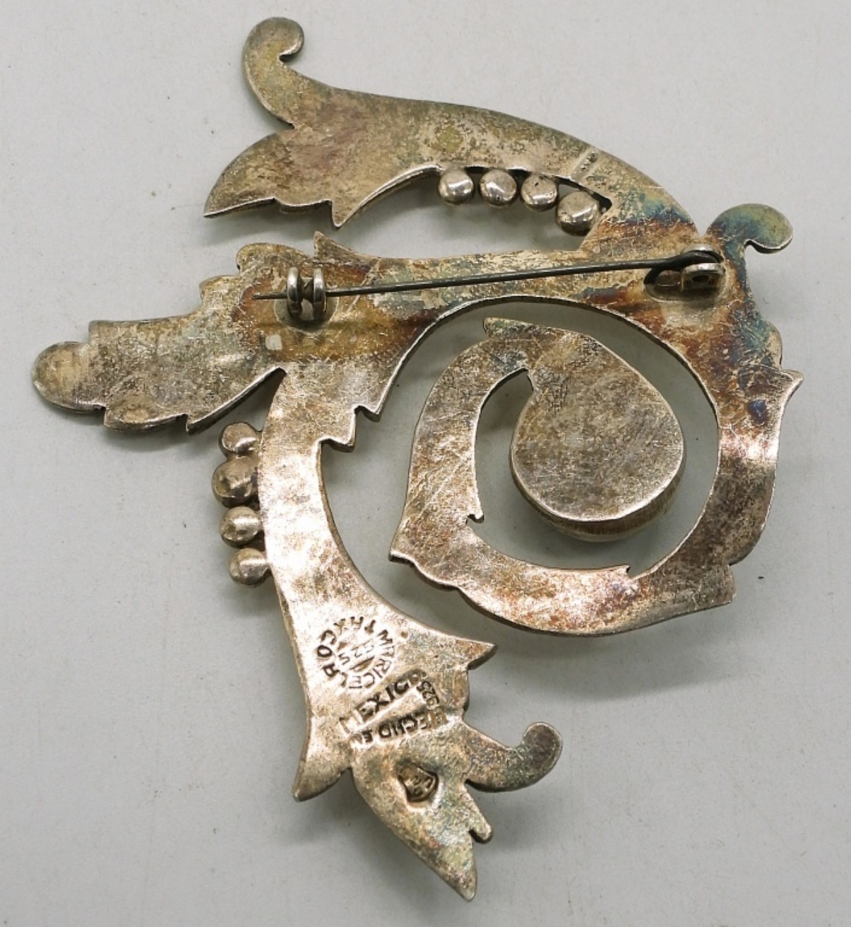 Maricela Taxco sterling brooch with green turquoise gemstone. 3″ x 2.5″. (12.5 dwt)