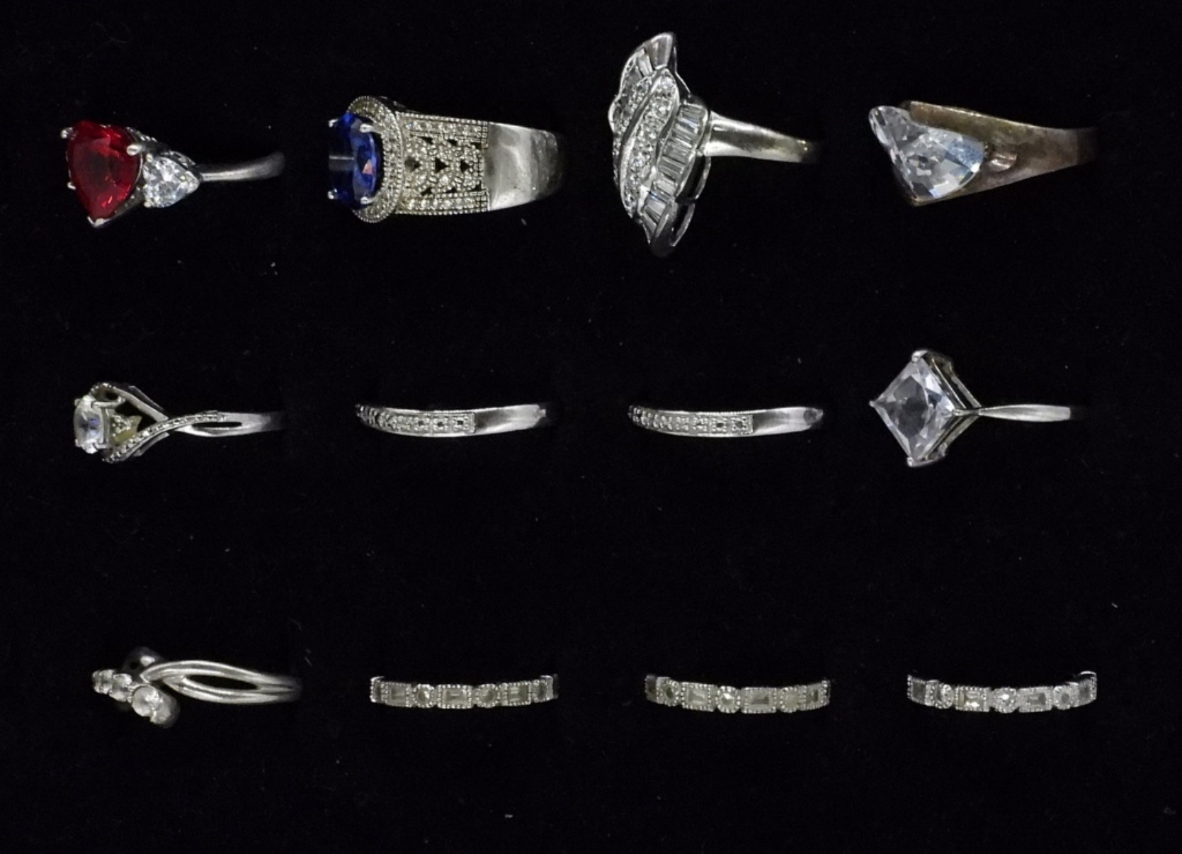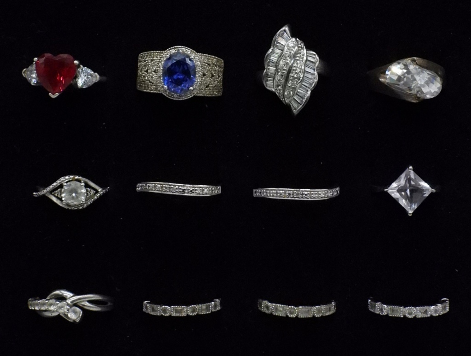 12 sterling rings. Simulated diamonds, simulated ruby & simulated Tanzanite. Sizes 6-9.5 (26.5 dwt)