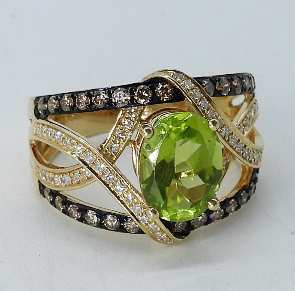14k yellow gold Peridot center stone. White and Champagne Diamonds. EFFY brand. Size 6 (3.6 dwt with stones).