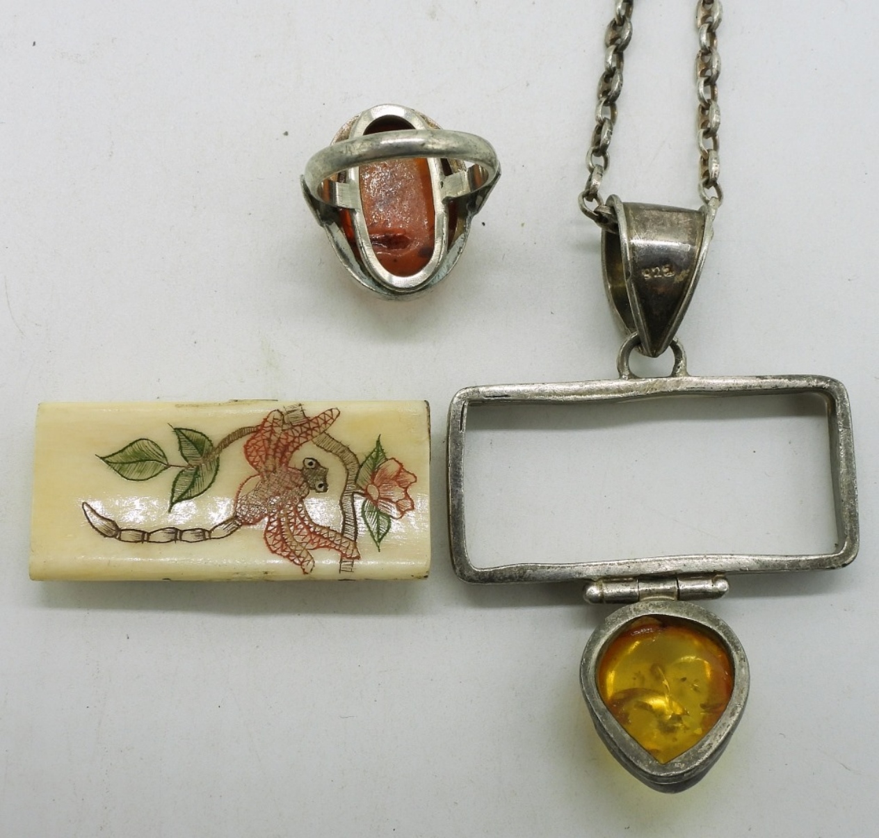 Sterling necklace with amber and a carved piece of bone (this piece is loose and falls out, needs to be reset), 18″. Amber sterling ring, size 6.5 (22 dwt)