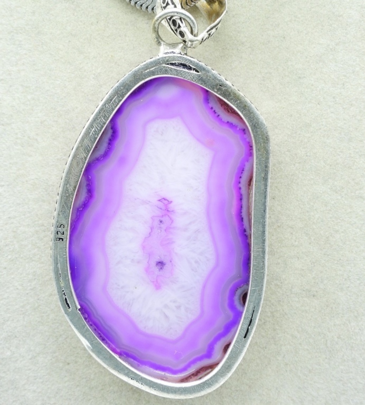Large pink agate pendant, 3″ long. On a sterling chain, 16″. (15 dwt)