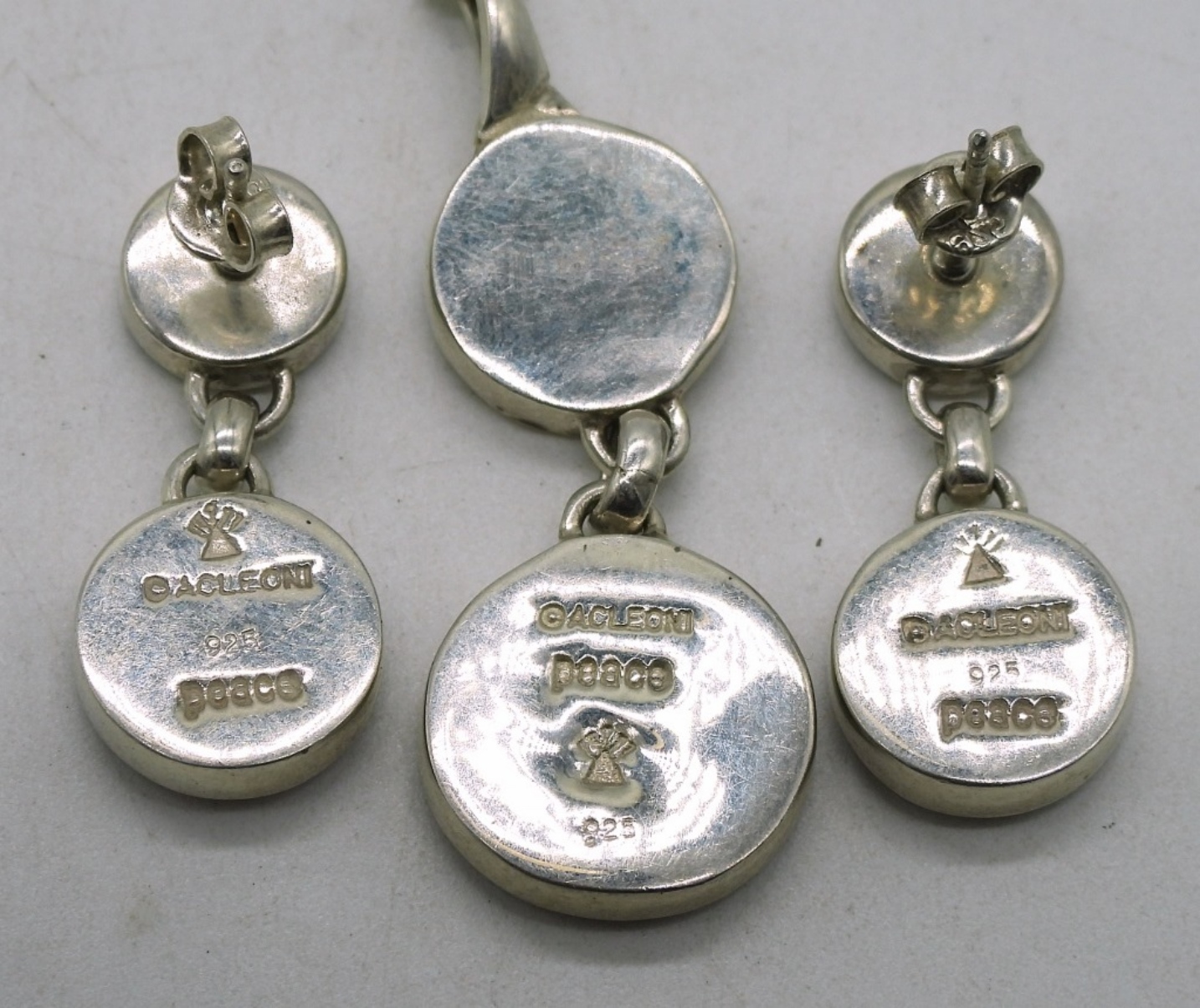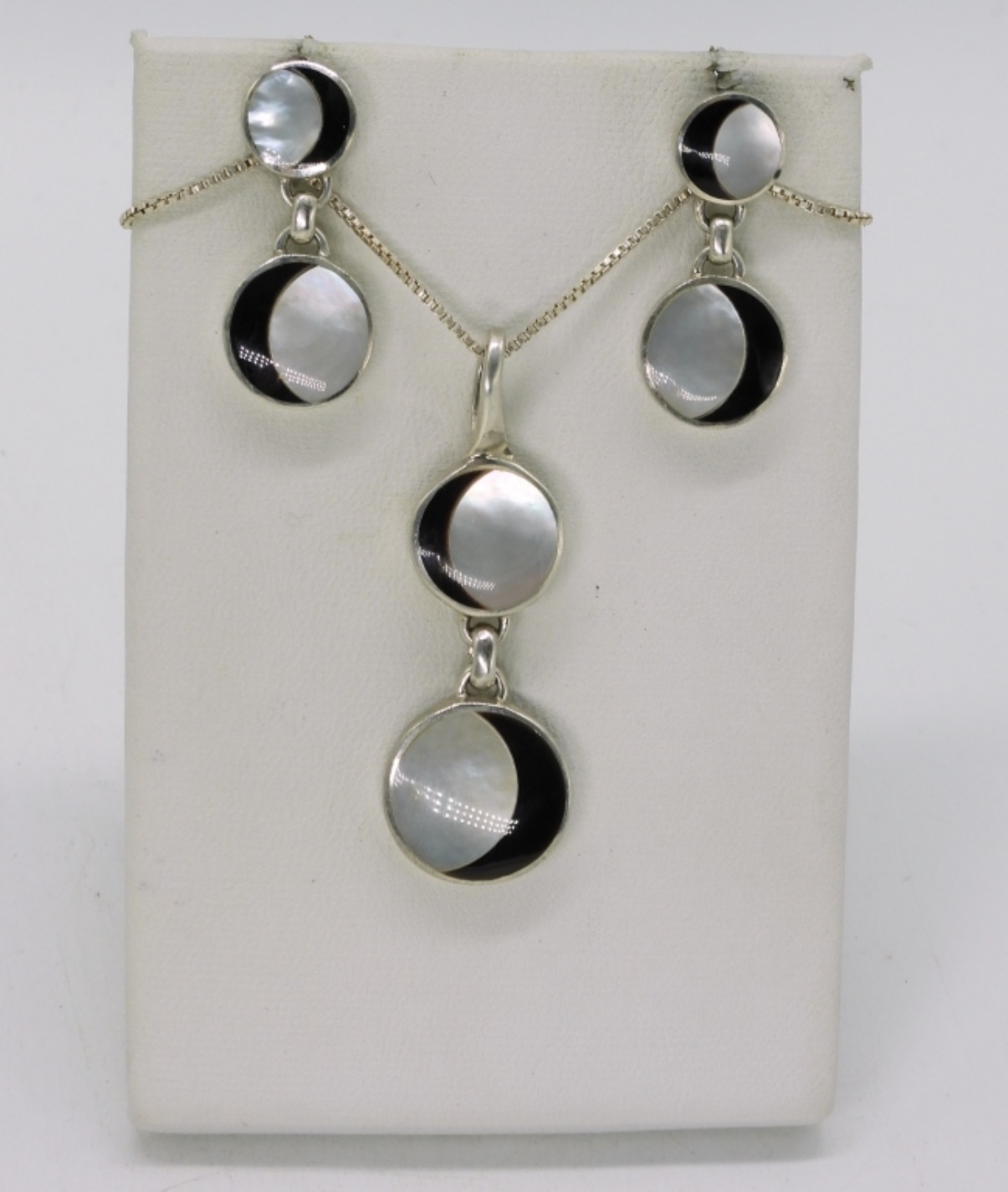 aCleoni brand, Necklace & pierced earring set. Mother of pearl and jet. Pendant-2″. Chain-18″. Earrings-1″. Necklace retails for $120. Earrings retail for $135. (8 dwt)