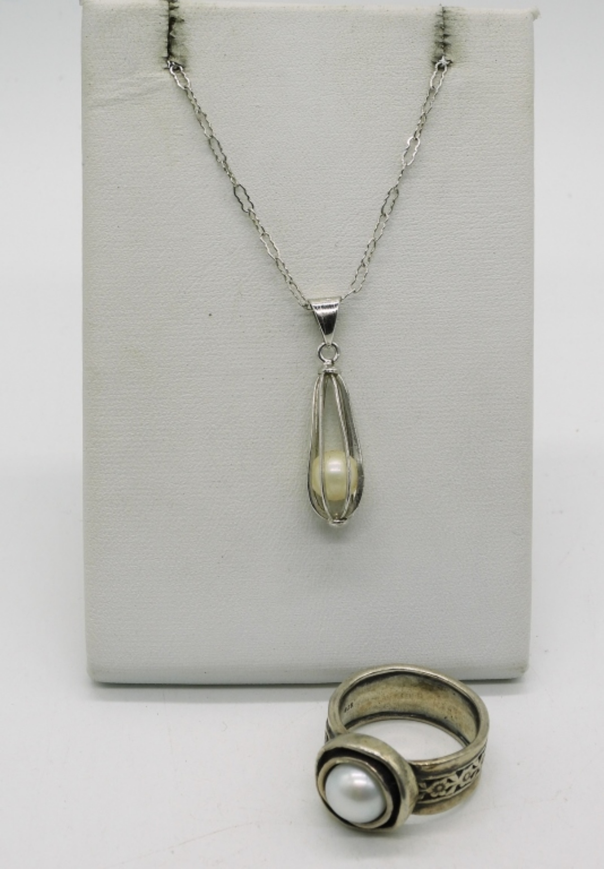 Vintage sterling pearl necklace, 16″. Israel pearl ring, size 7. (6.4 dwt)