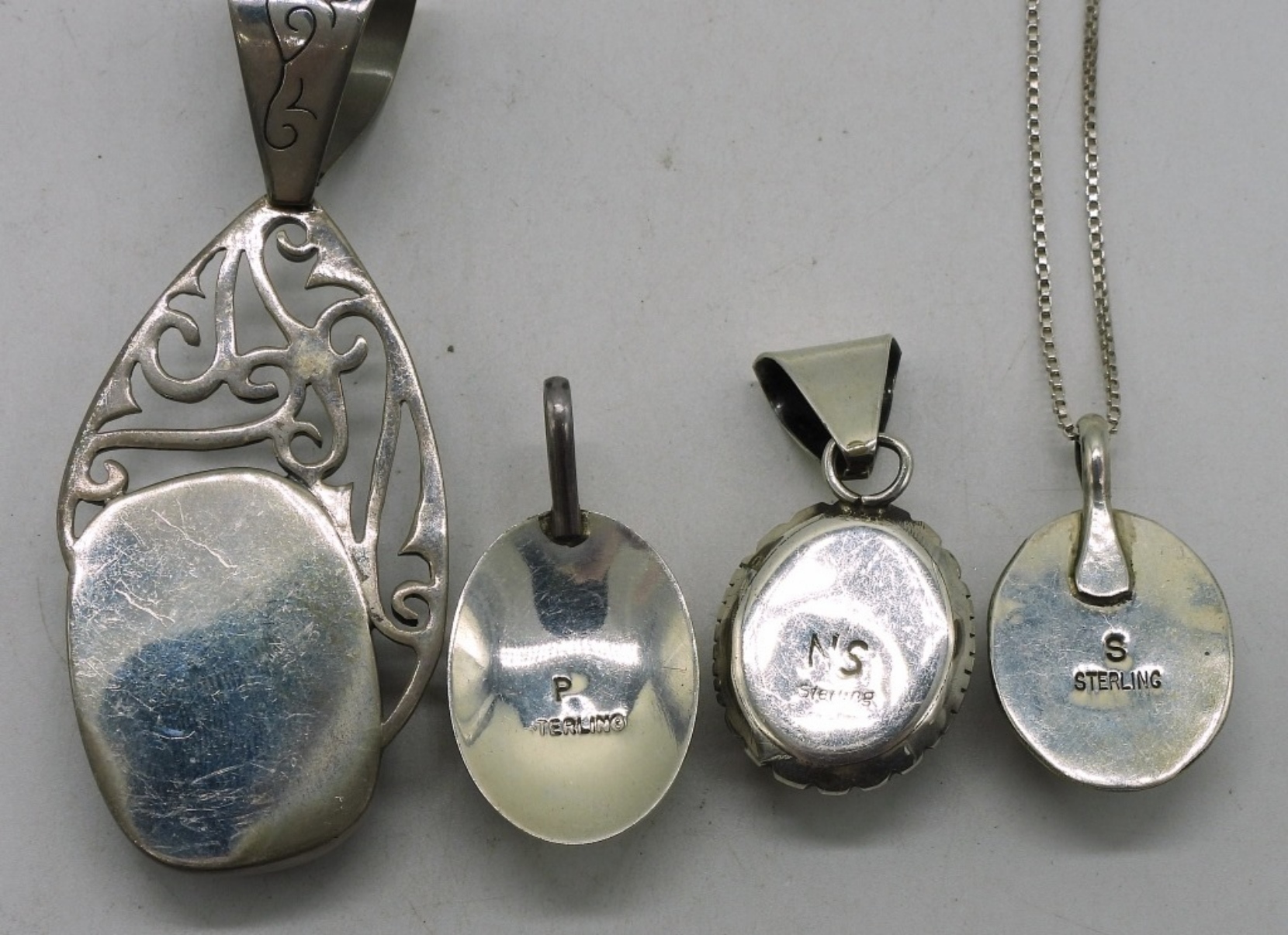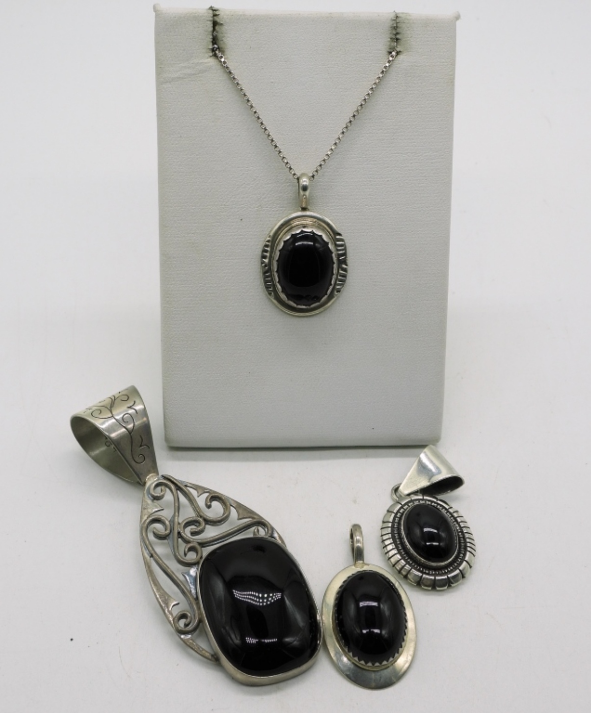 Four sterling black onyx pendants, 1-3″. One sterling chain, 18″. (22 dwt)