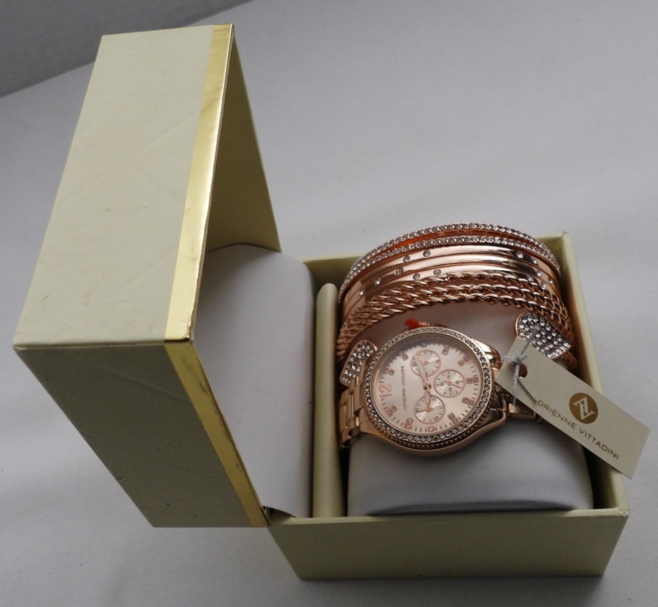 Watches are not verified, authenticated, or tested in running condition unless specified, Adrienne Vittadini, rose-gold-tone watch and bracelets, original tag and box