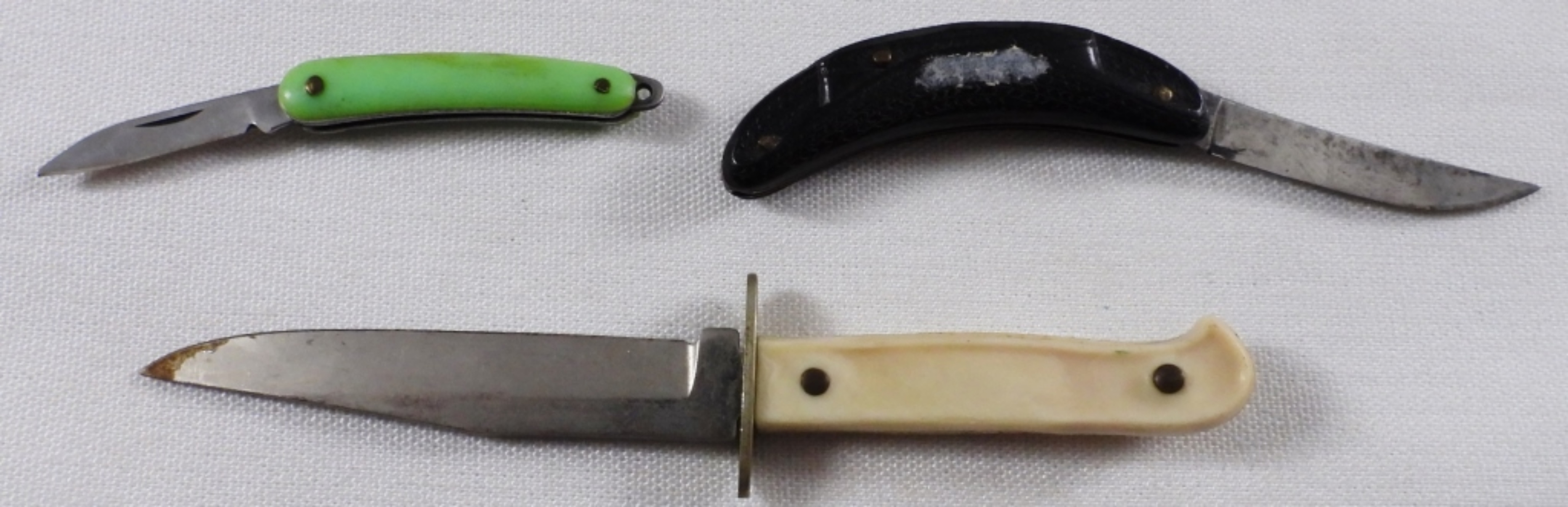 4″ mini hunting knife, 2″ green folding knife, and 3″ black folding knife