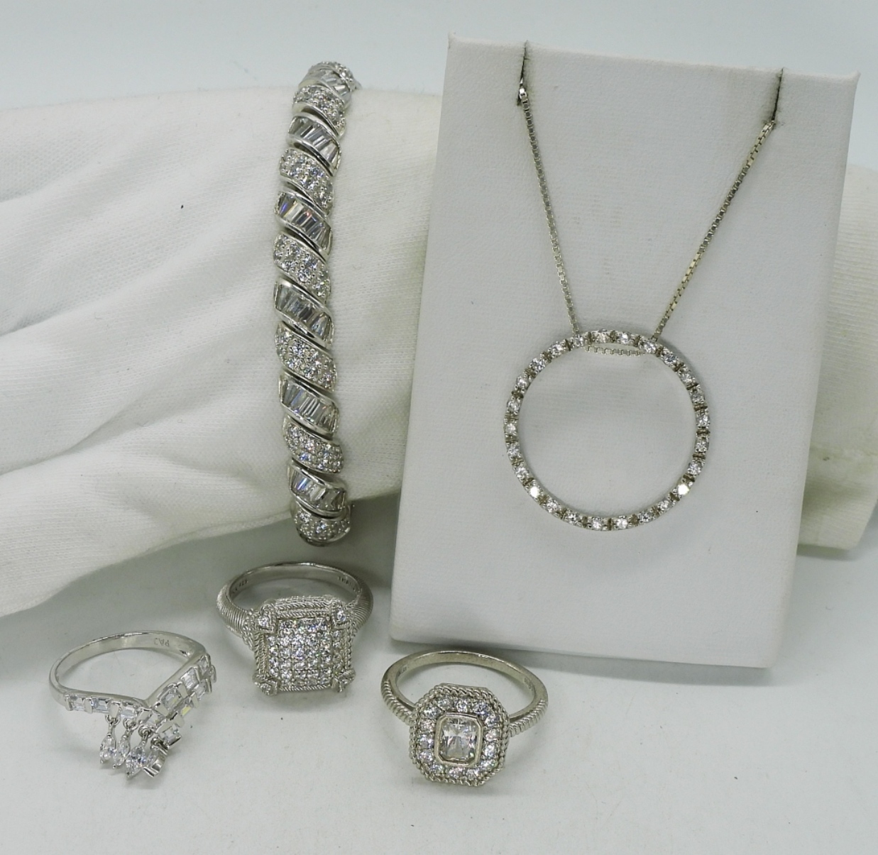 3 Simulated diamond rings, sizes 9 & 10. Bracelet is 8″ and necklace is 16″. (30 dwt)