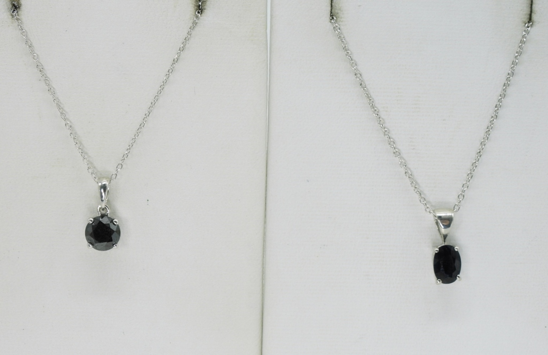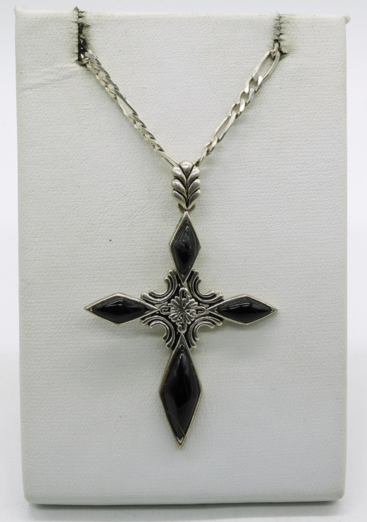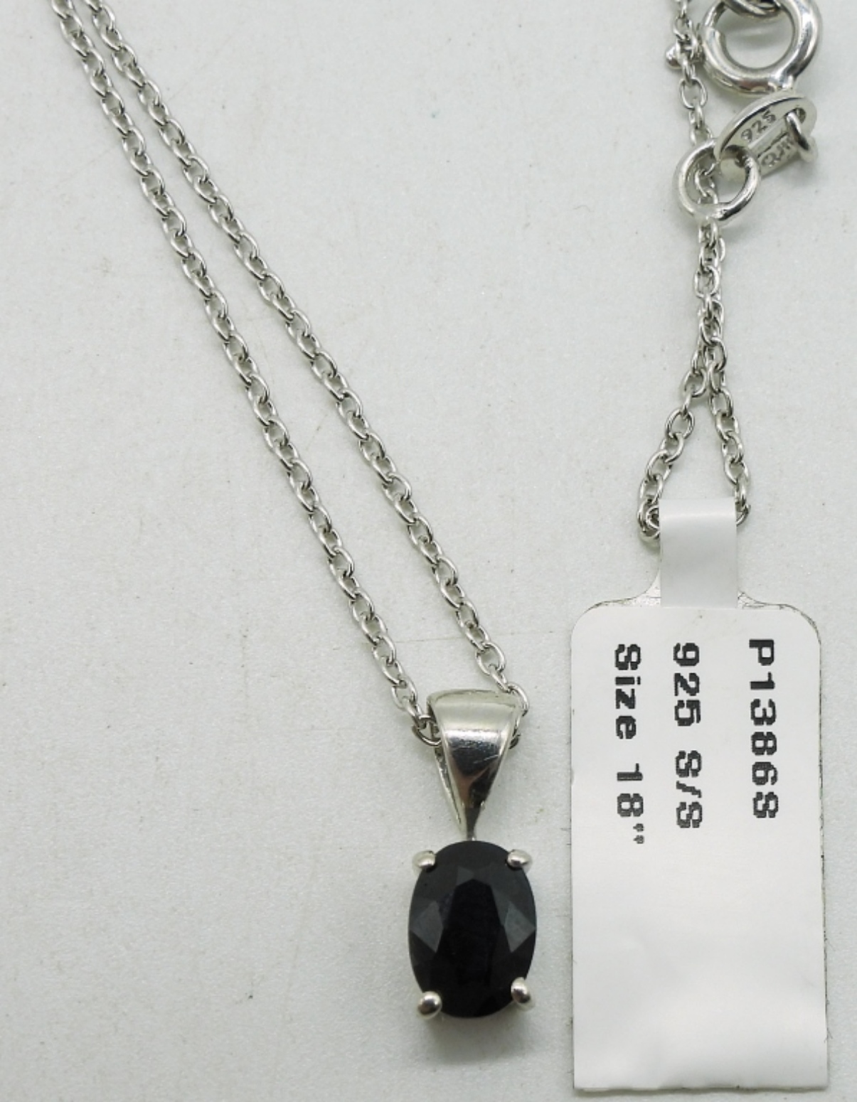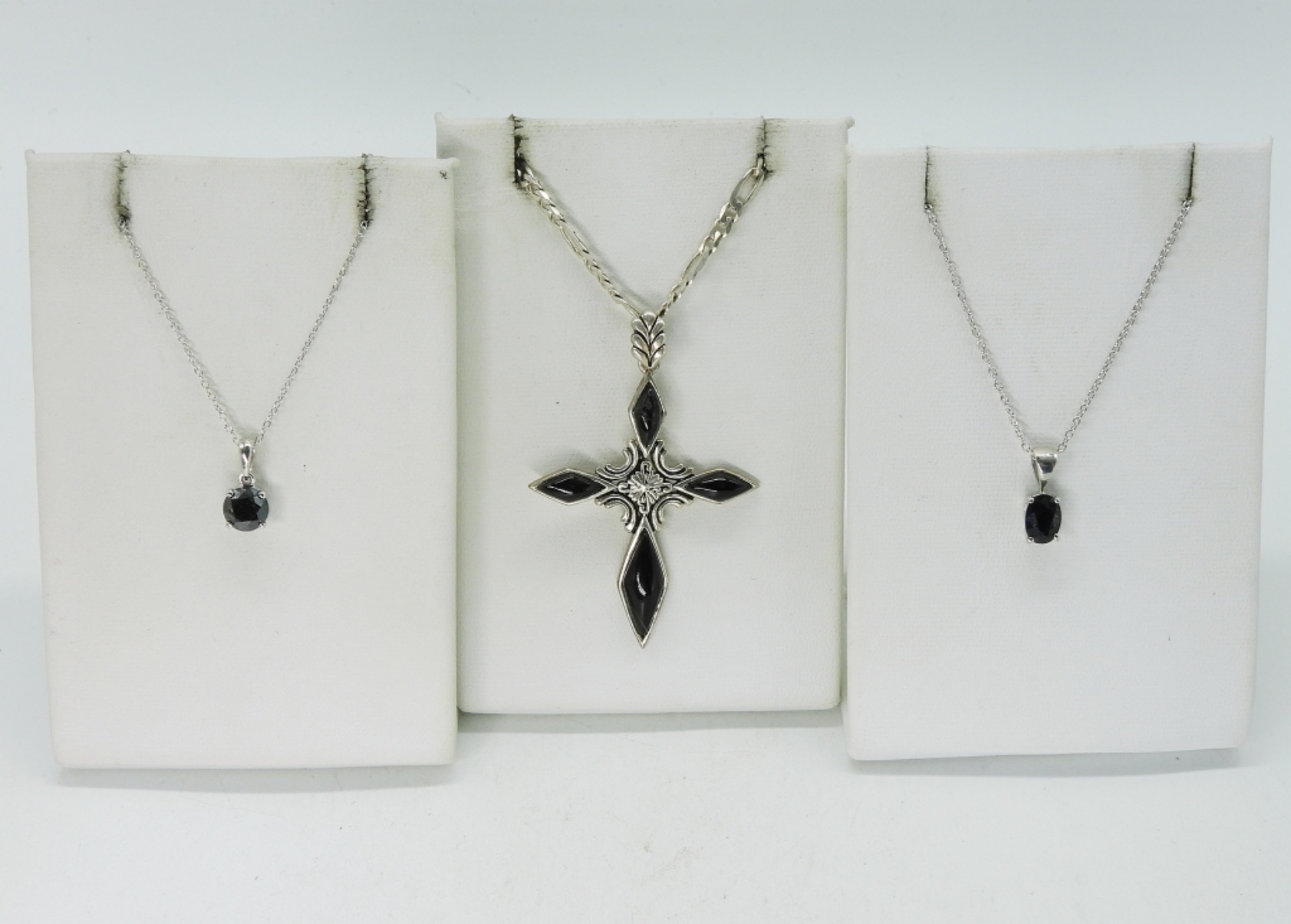 Three sterling necklaces. Cross has black onyx gemstones, 17″ chain. Round hematite gemstone necklace, 18″. The darkest oval shaped sapphire I’ve ever seen, new with tag, 18″. (8.6 dwt)