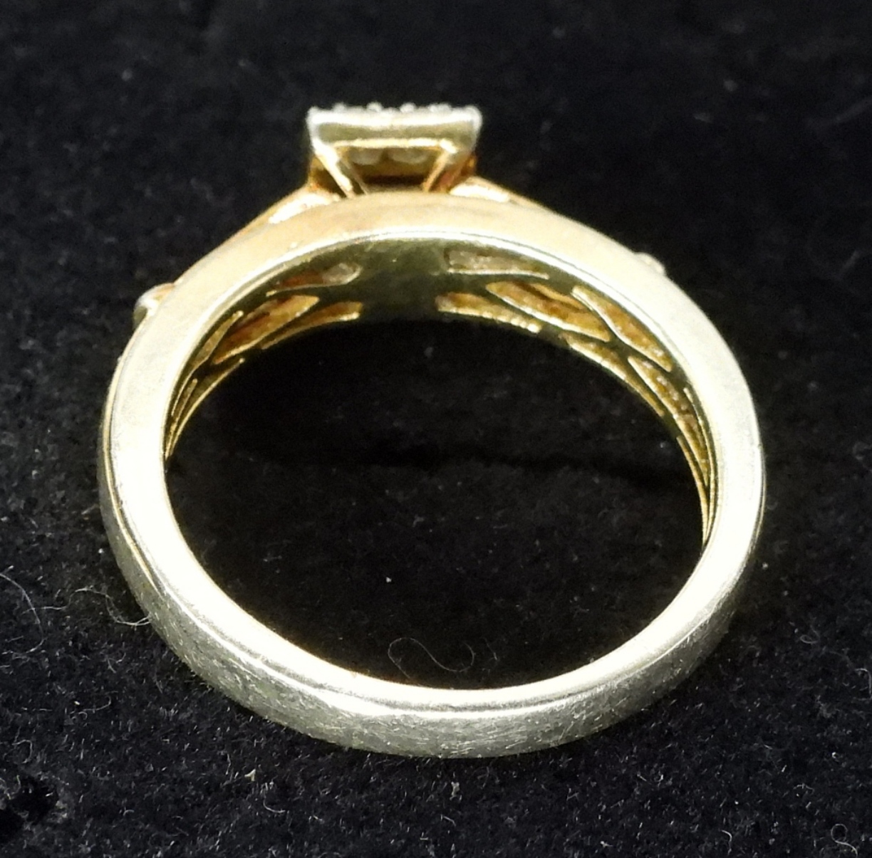 Sterling gold tone ring with four princess cut center diamonds, surrounded by round diamonds. Carat Weight Unknown. Size 7. (2.5 dwt)