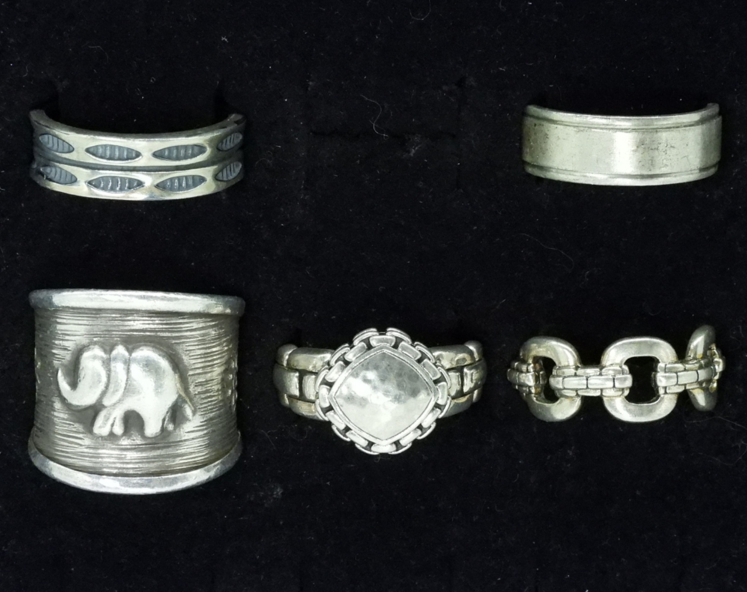Five sterling fashion rings. Sizes 10, 11, 12. (32.8 dwt)