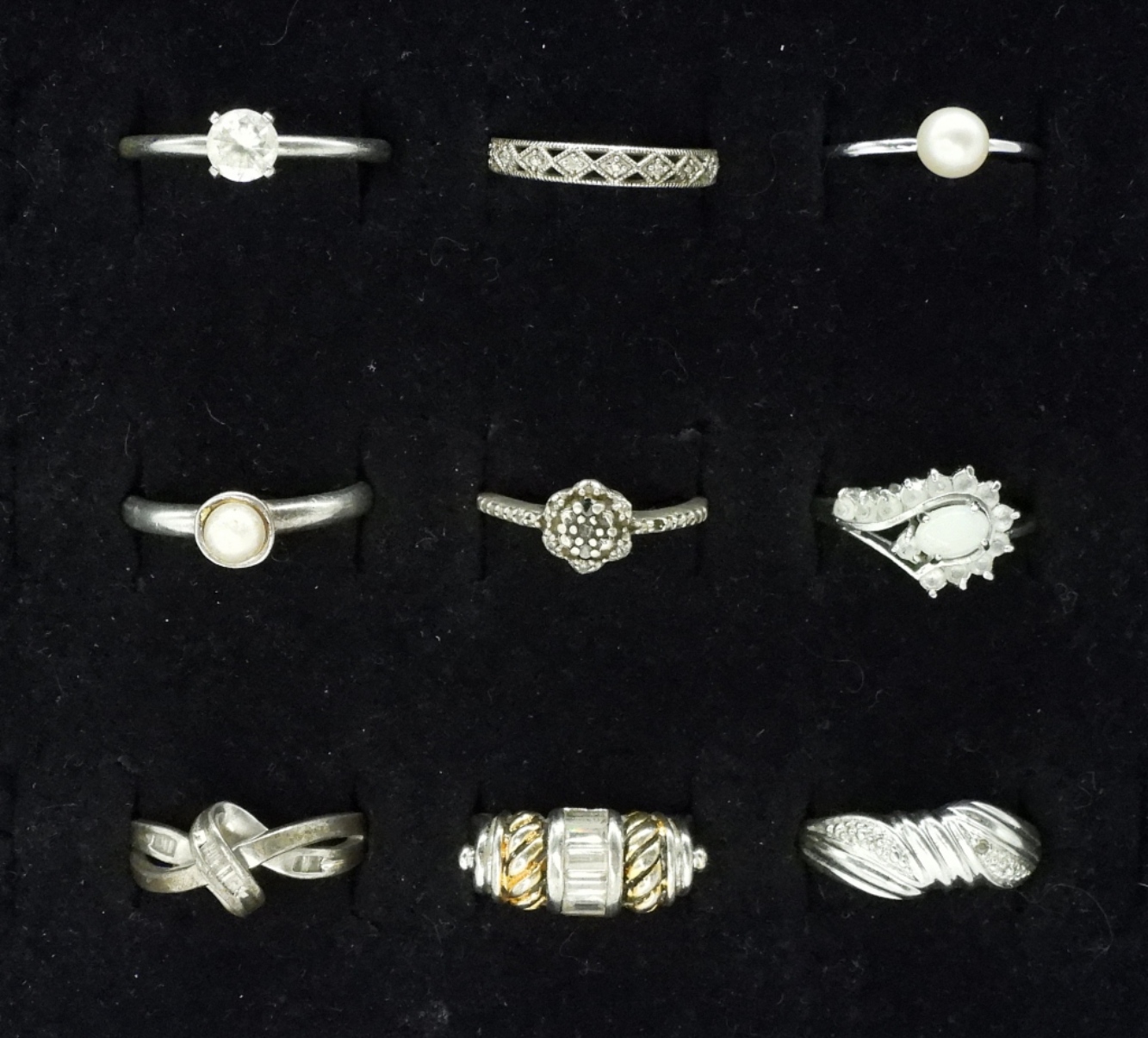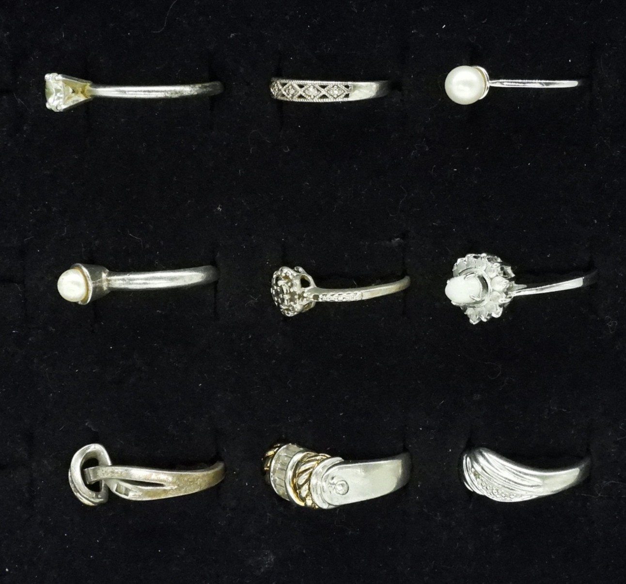 Nine sterling rings. Pearls, Opals & simulated diamond. Sizes 5-10 (17 dwt)