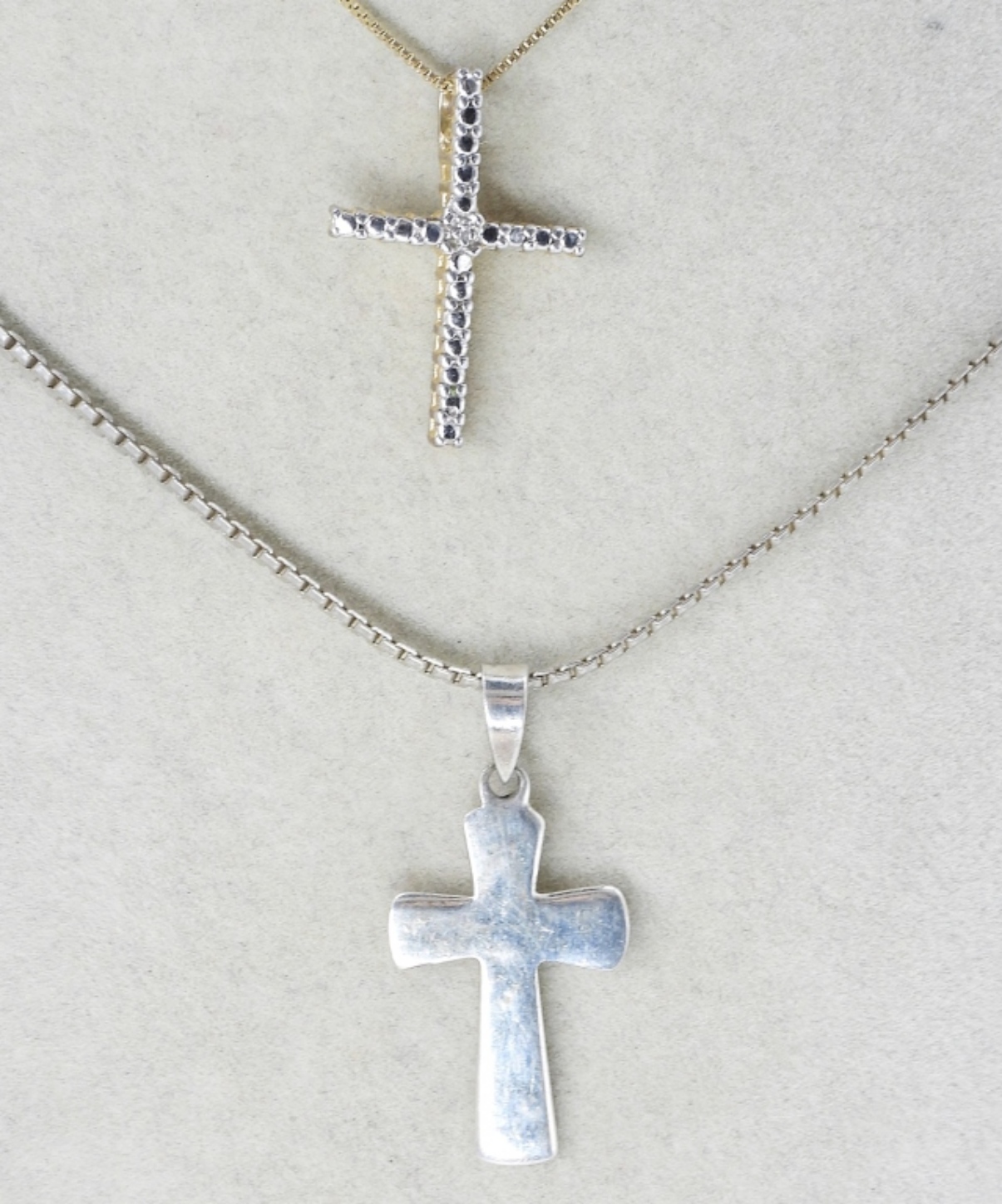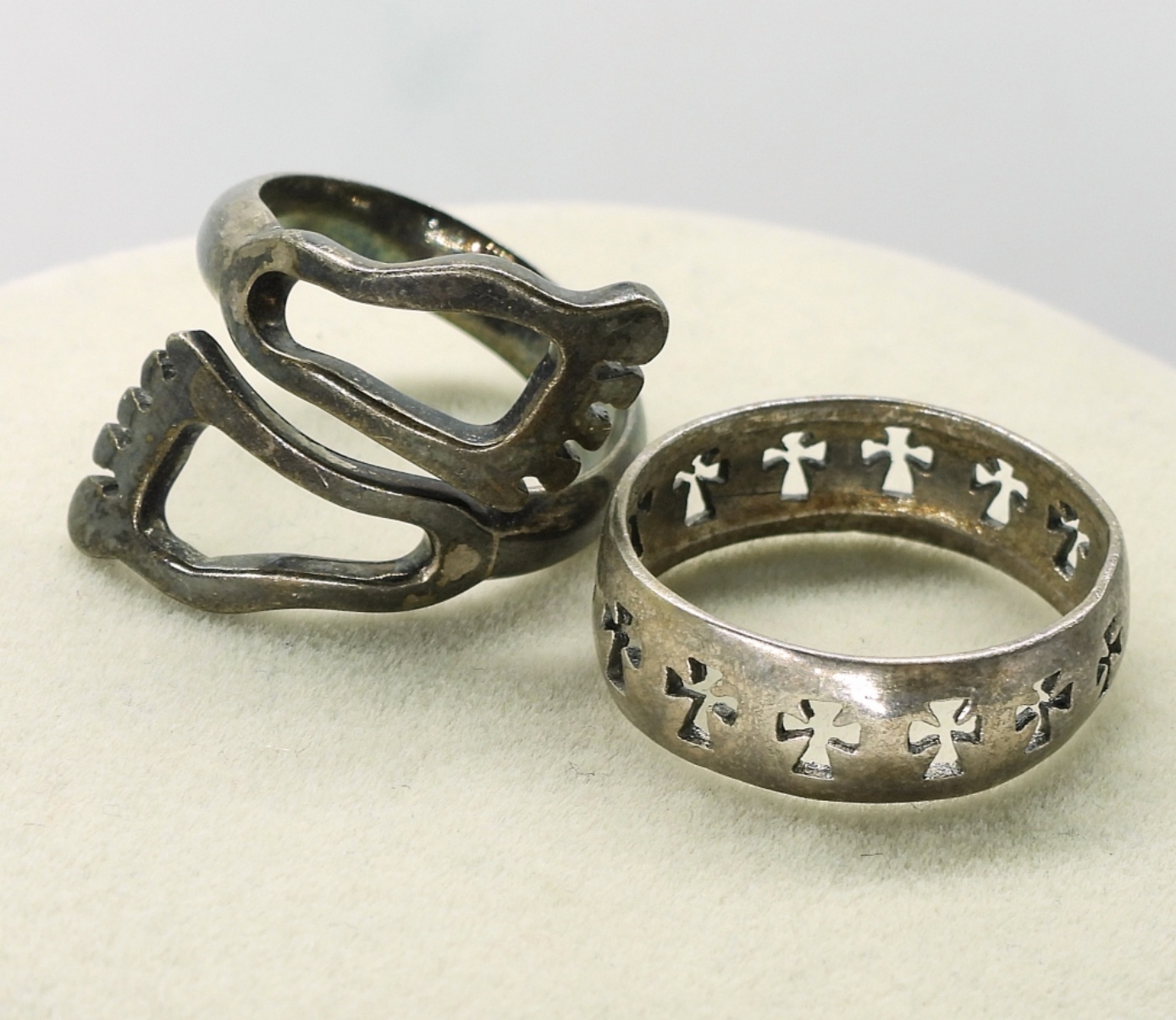 Two sterling cross pendant necklaces, 18-20″. Faith cross sterling anklet, 10″. Two rings, size 7 (13 dwt)