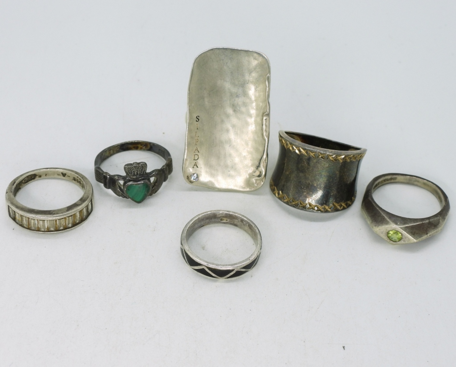 6 Sterling Rings. Silpada, Malachite, Onyx, Simulated Diamond. Sizes 5-9 (19.7 dwt)