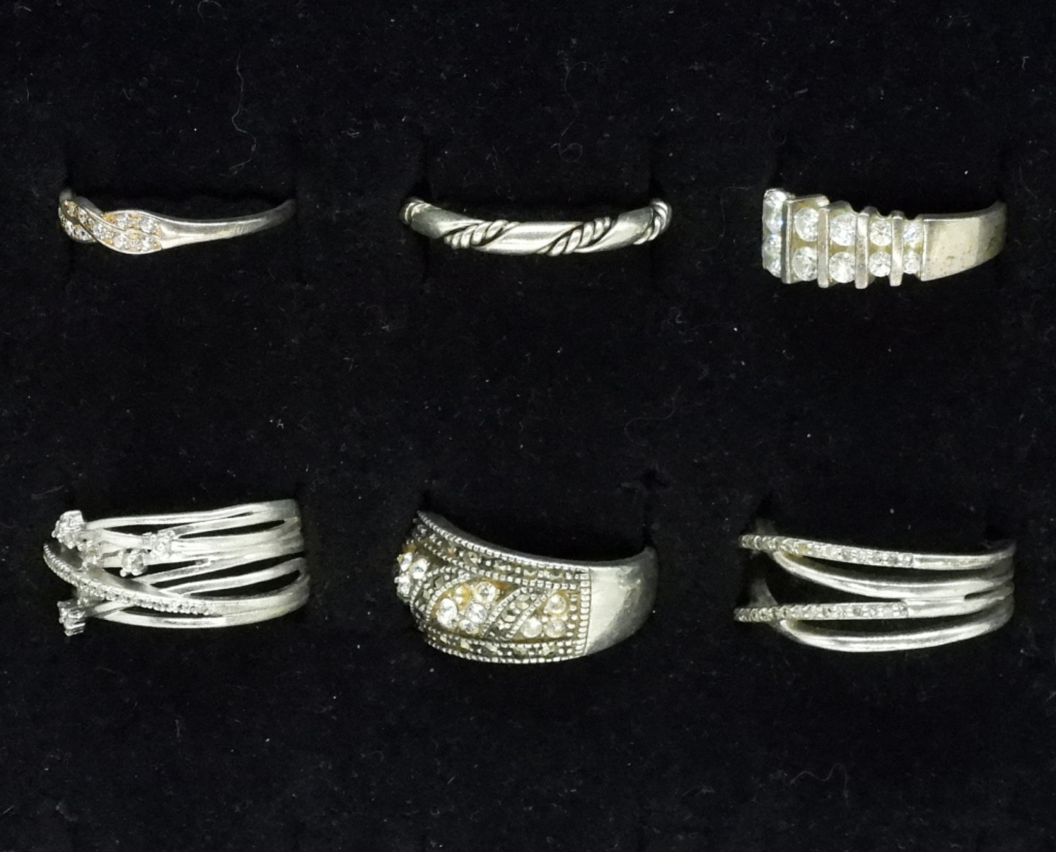 Six sterling, simulated diamond rings. Sizes 5-9 (17.4 dwt)