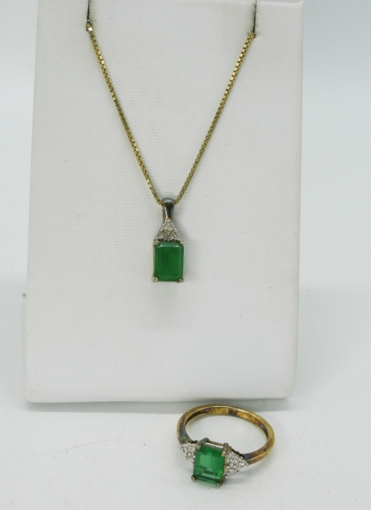 Sterling gold tone, simulated emerald necklace 16″. Matching ring, size 7 (3.2 dwt)