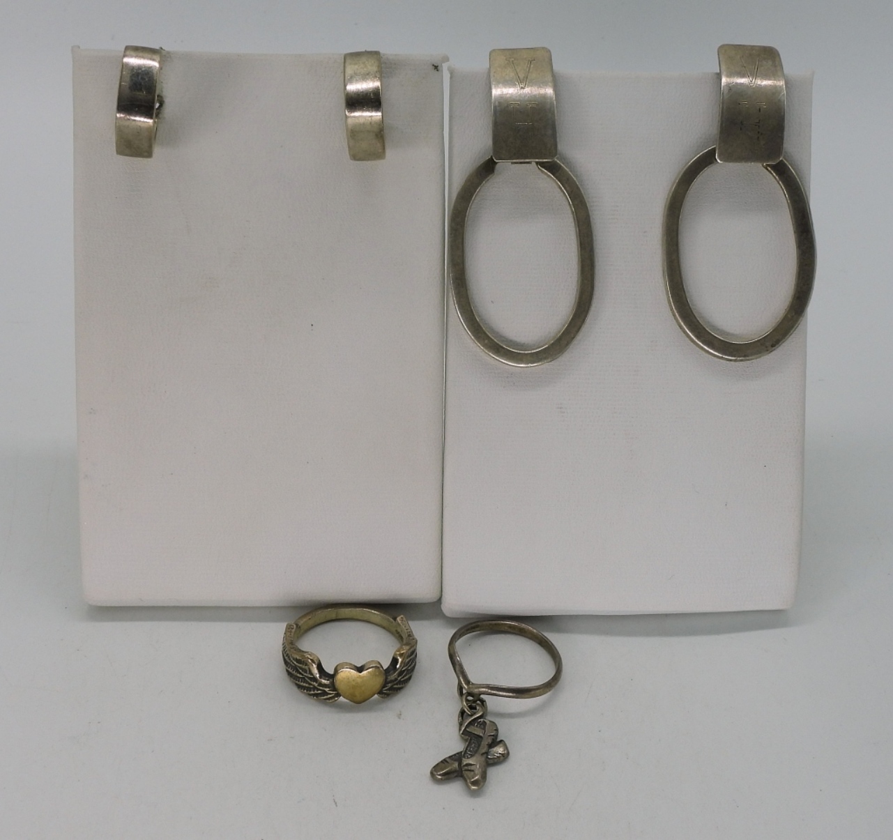 One pair of pierced Taxco (TV-124 Mexico 925) 2″ long. Two rings, sizes 6 & 7.5 (17.3 dwt)
