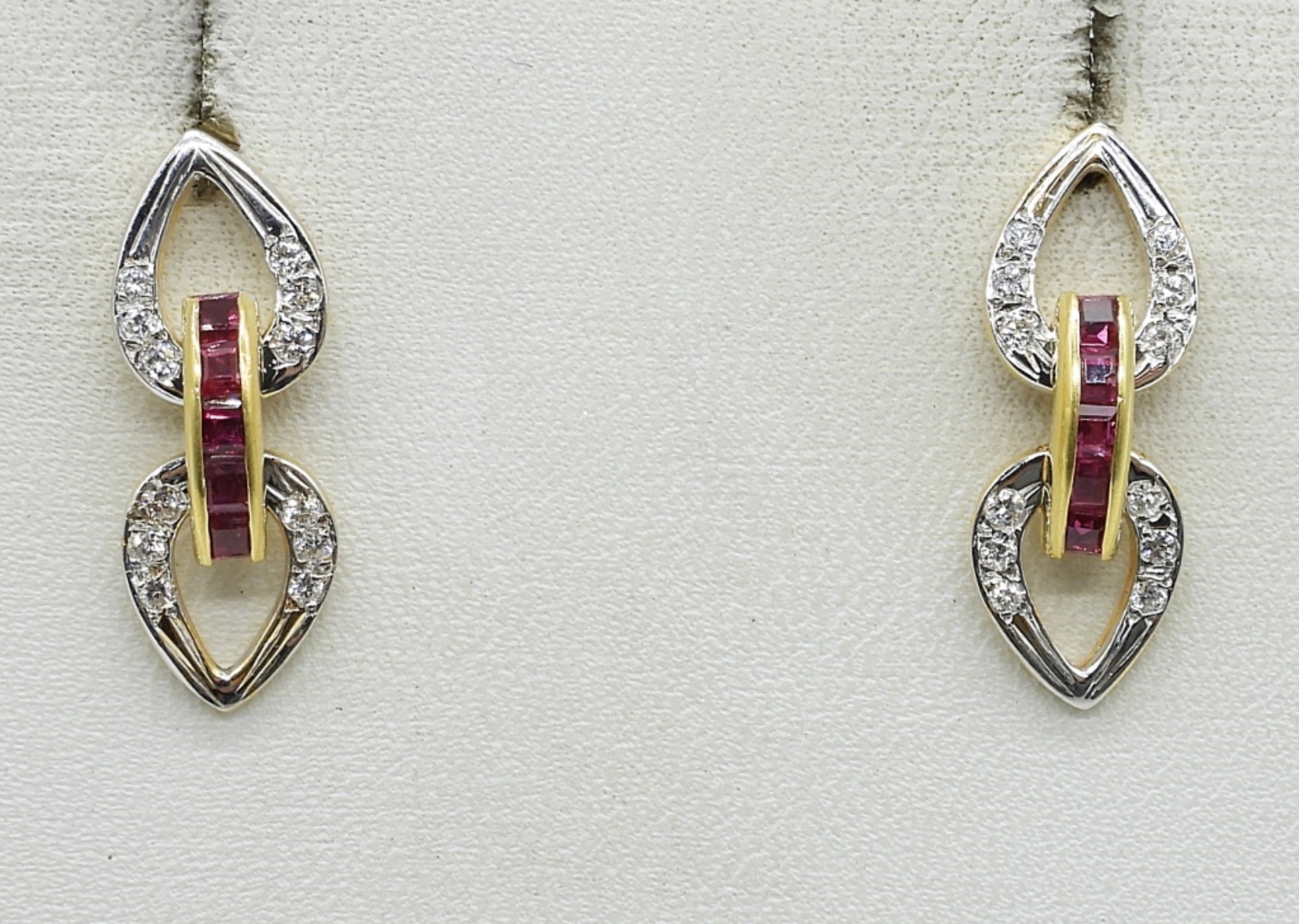18k yellow gold pierced earrings. 24 diamonds (.24 tw), 10 square cut rubies (unknown tw). 1″ long.