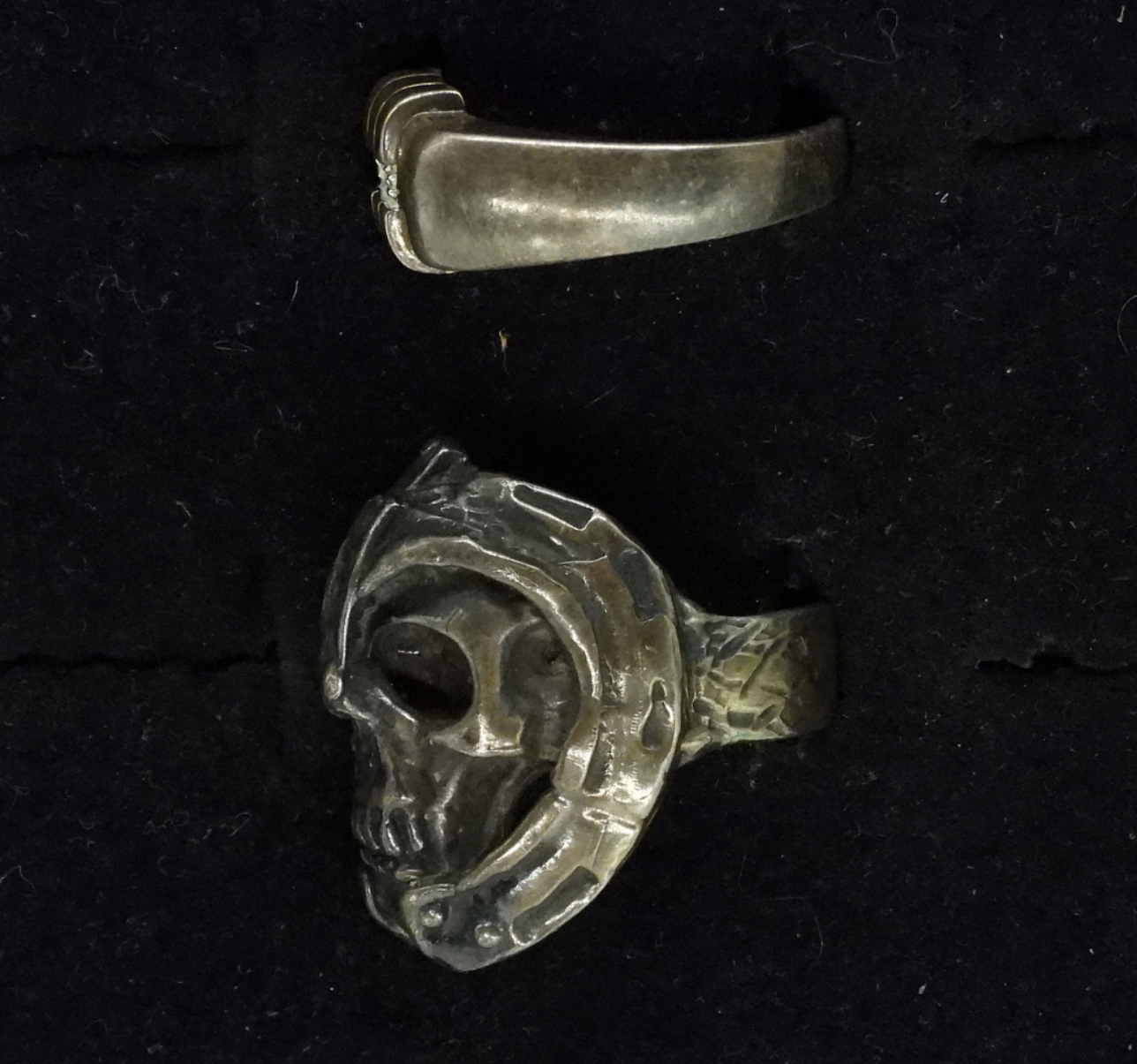Sterling helmeted skull ring, size 10.5. Sterling band, with 10k yellow gold accents & 3 tiny moissanite gemstones, size 11. Both rings are tarnished and need to be cleaned. (22.7 dwt)