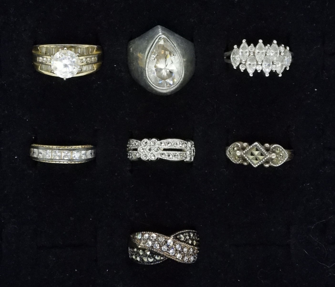 7 sterling rings, simulated diamonds. One is Taxco! Sizes 5-9 (27.8 dwt)