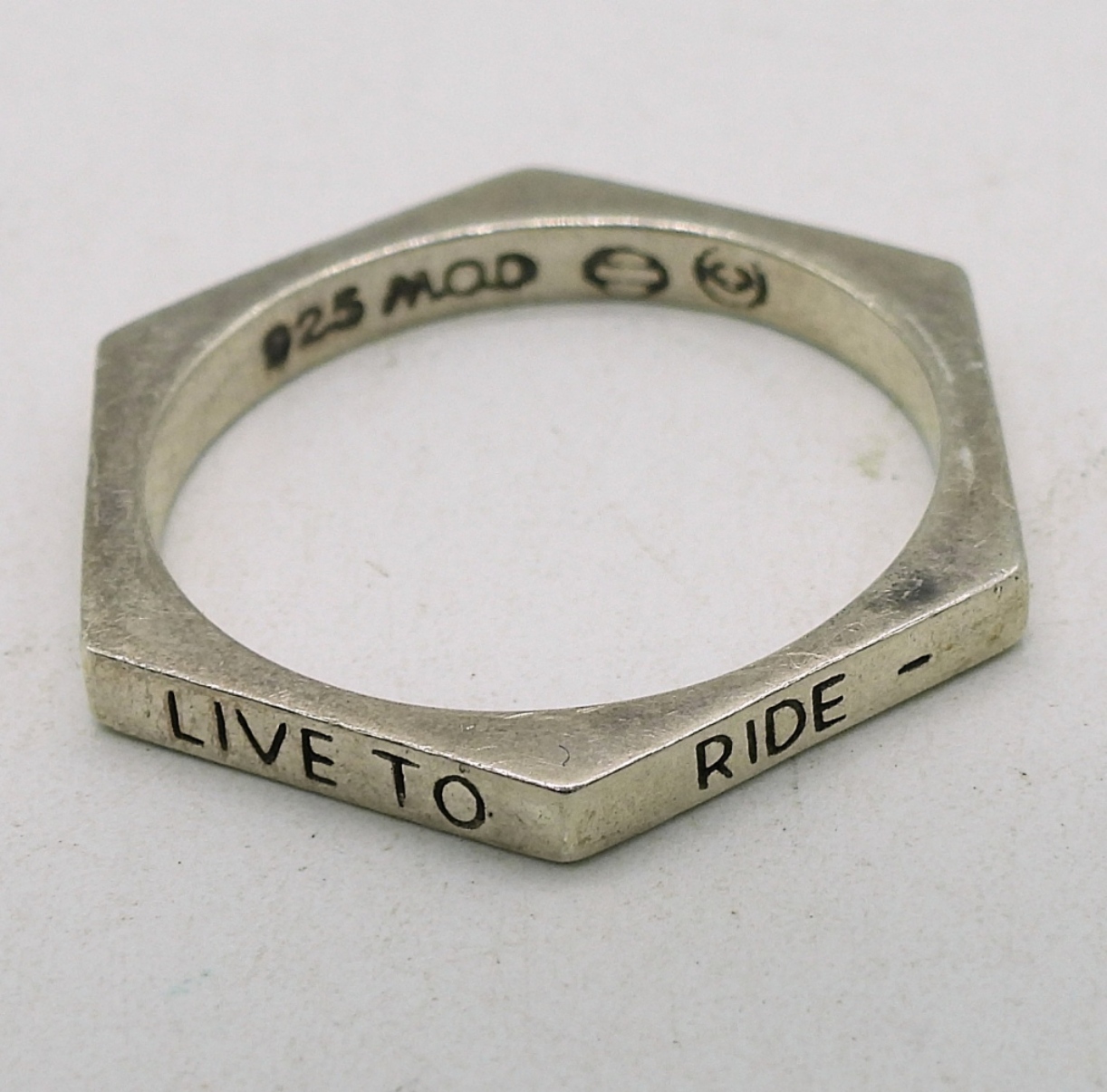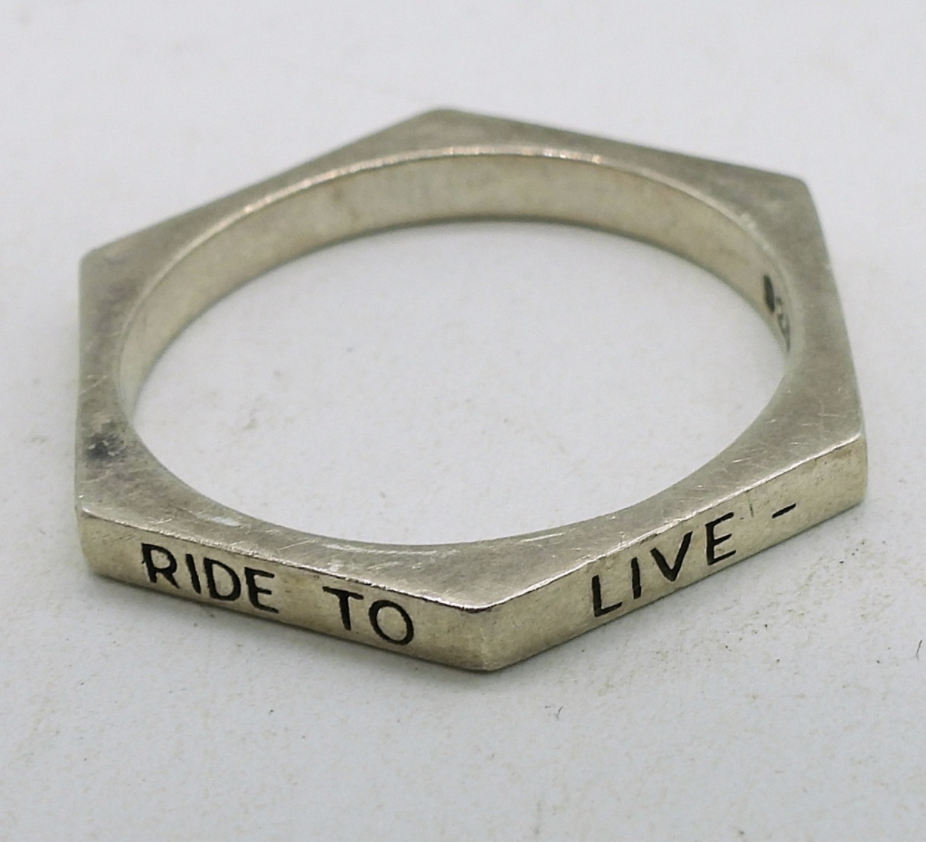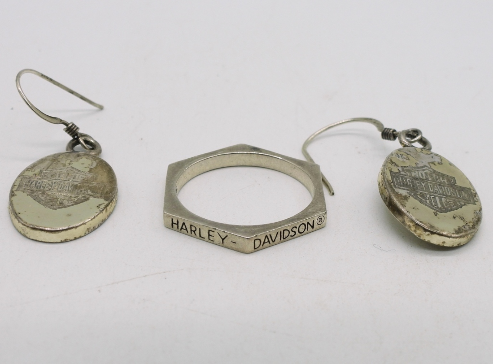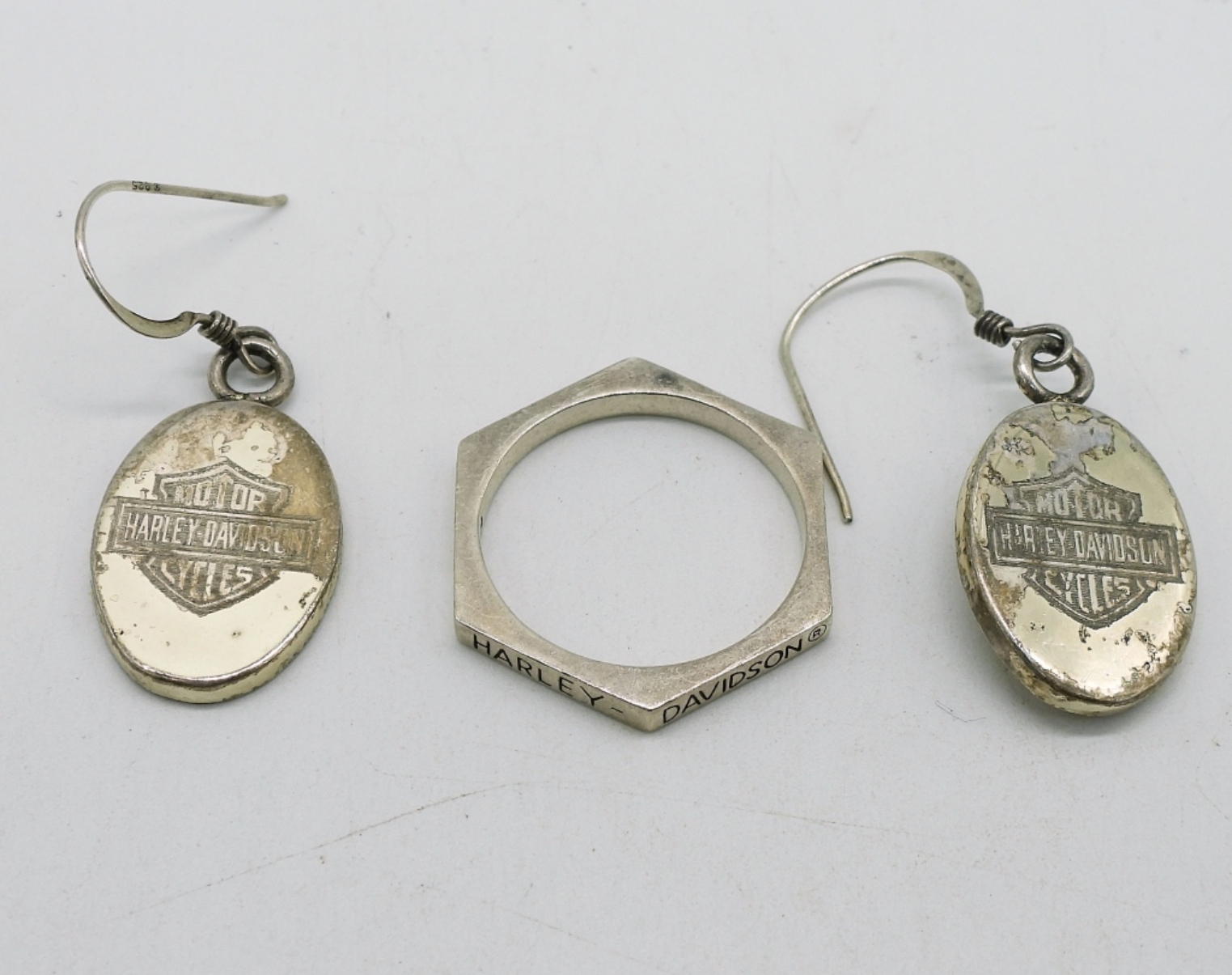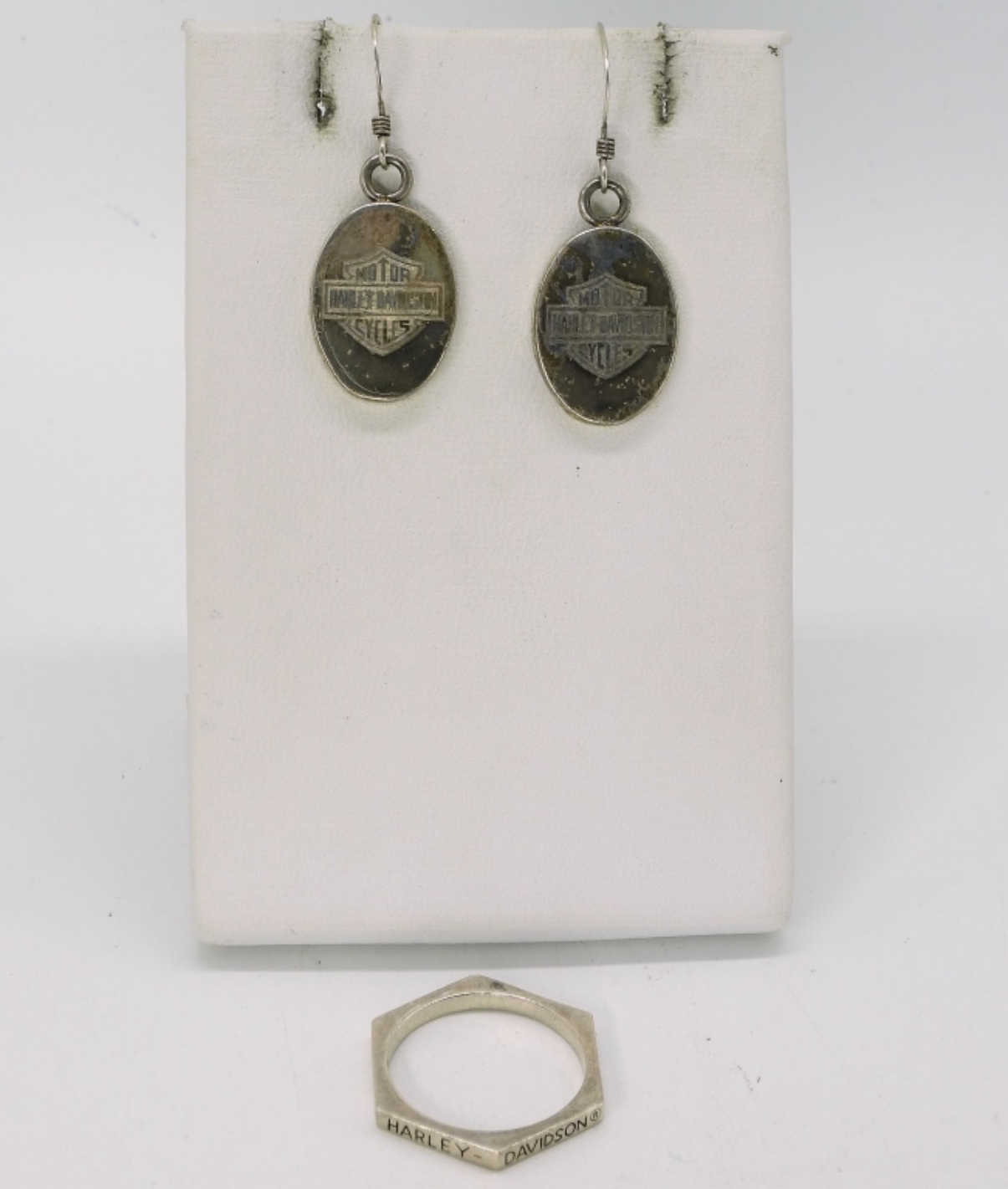 Harley Davidson, sterling pierced earrings. 1.5″ long. Ring is engraved “Harley Davidson – Live to Ride – Ride to Live”. Size 8. (6.6 dwt)
