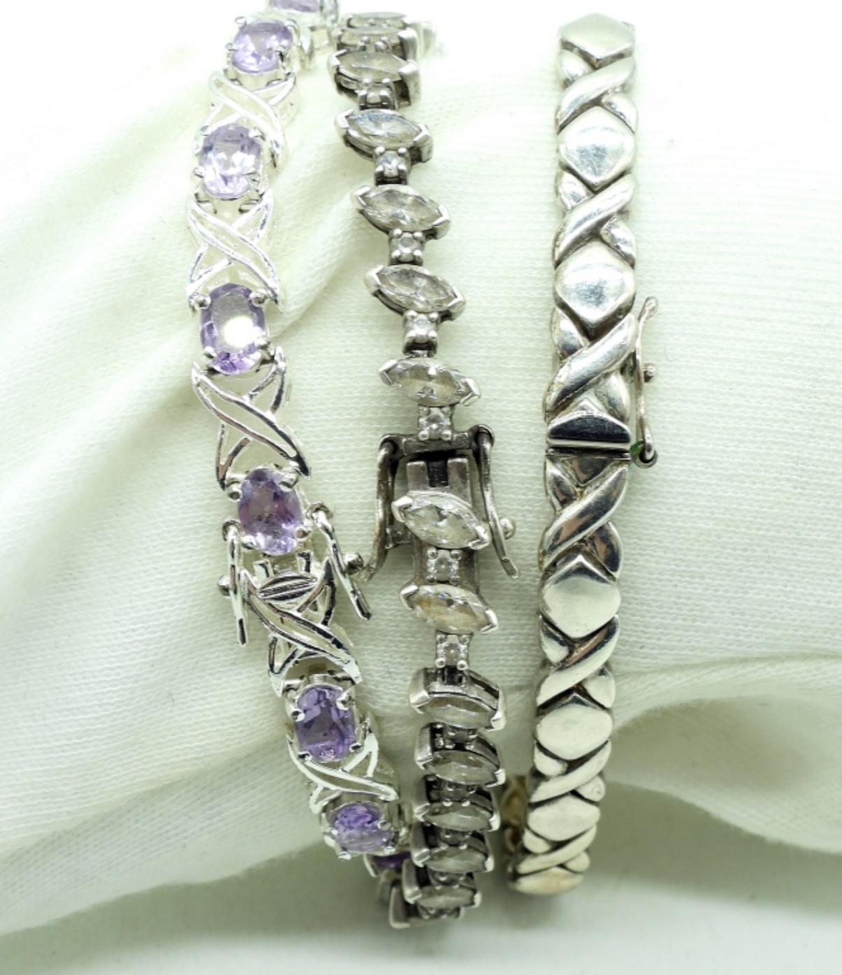 Three sterling bracelets. Amethyst, simulated diamond and vintage “xo”. 7-7.5″. (22 dwt)