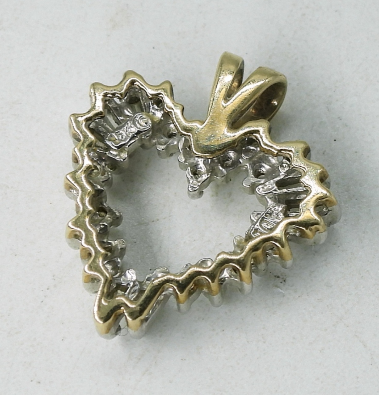 10k yellow gold diamond heart pendant with round and baguette diamonds. Carat Weight unknown. (1 dwt)