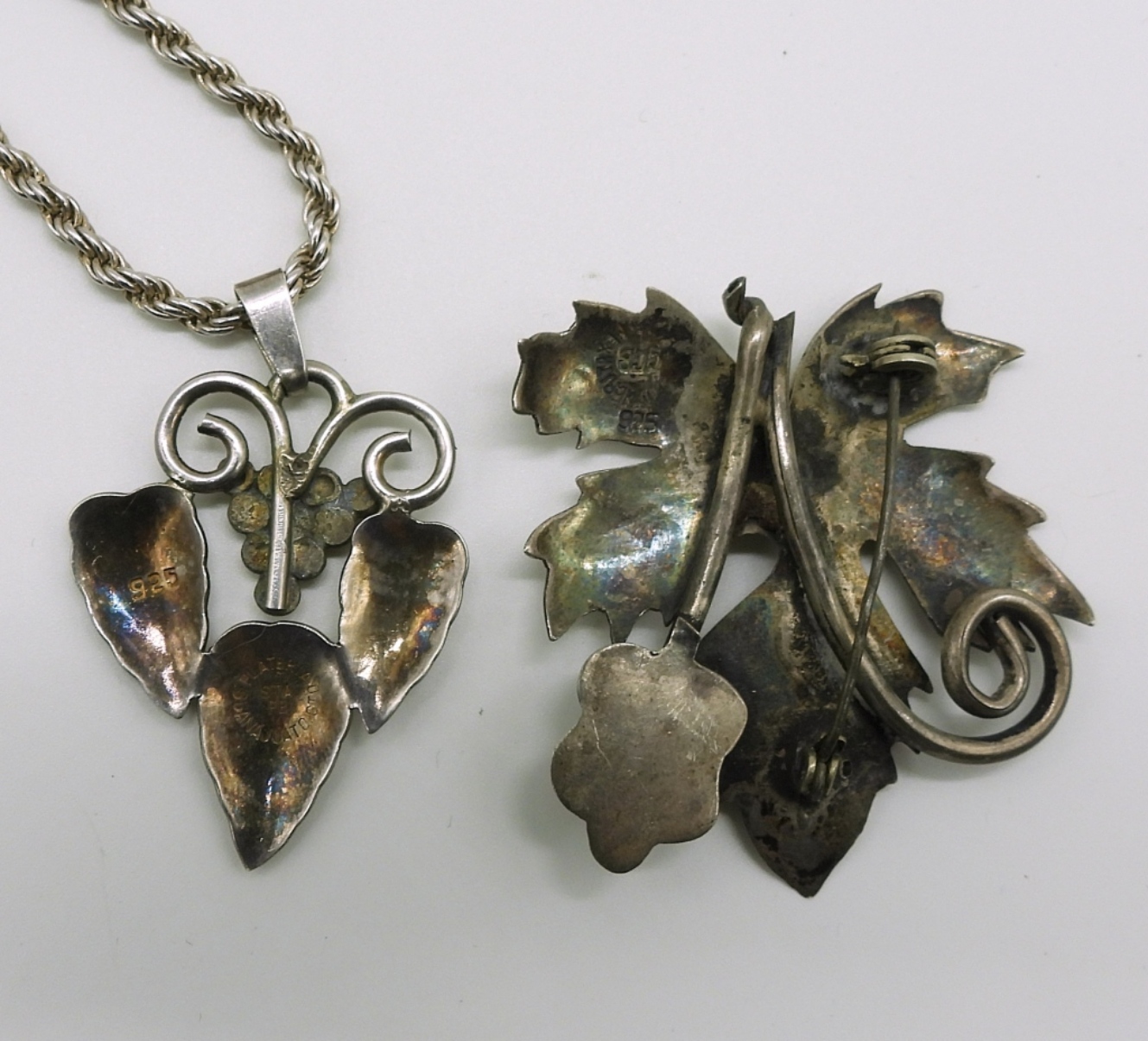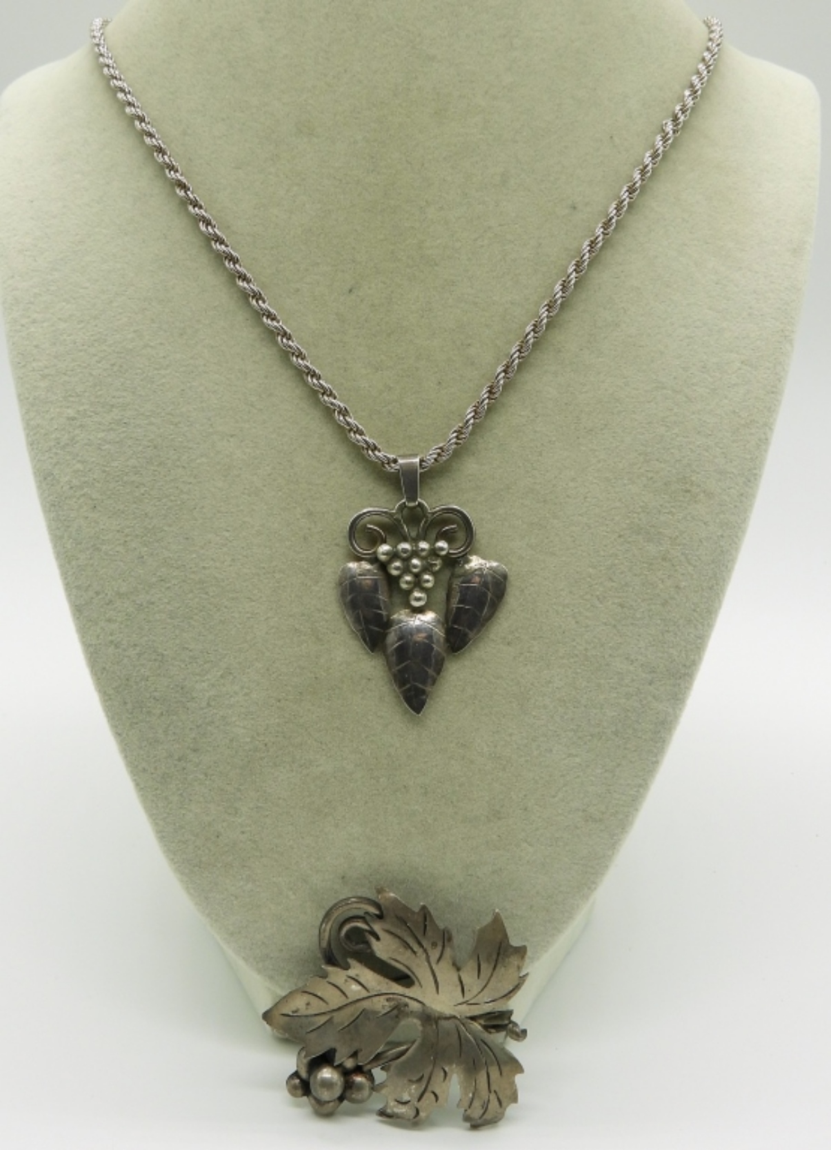Sterling Mexico leaf brooch, 2″. Sterling leaf/grape pendant on a 30″ sterling chain. (22.8 dwt)