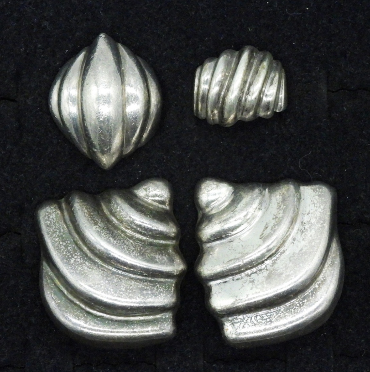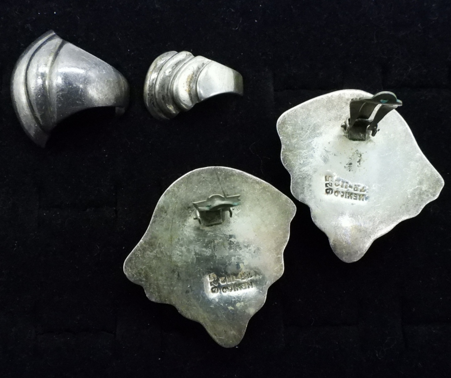 One pair of sterling Taxco clip on earrings. Marked “Mexico 925 TR-112″, 1.5” long. Vintage sterling rings, size 7-8 (37.2 dwt)