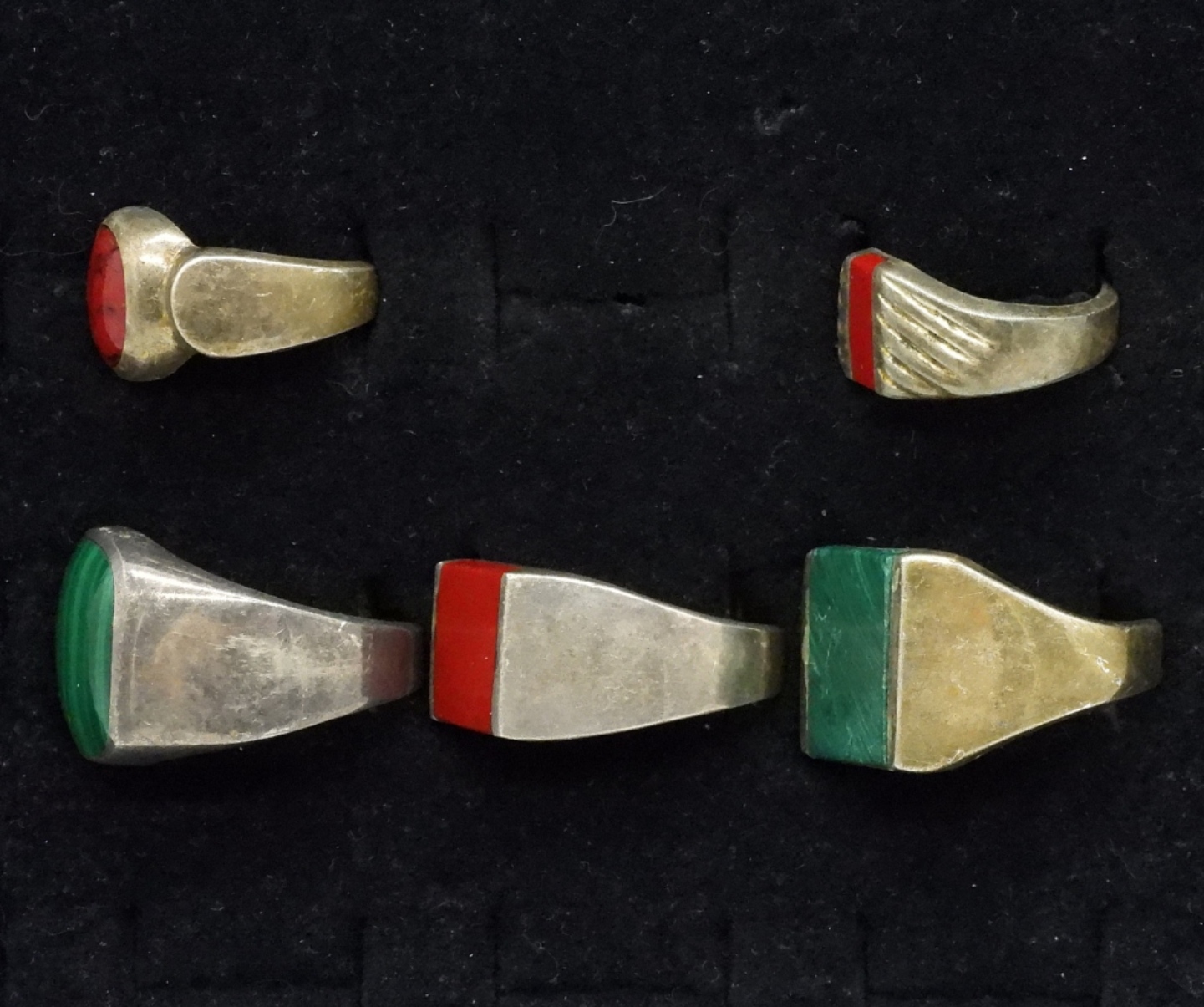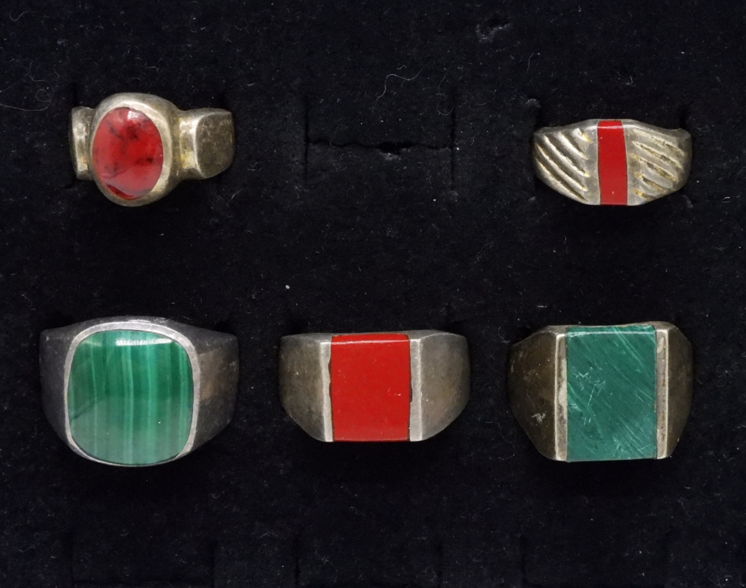 Five sterling vintage rings. Red coral, malachite and red turquoise gemstones. Sizes 7, 13, 13.5 (36 dwt)