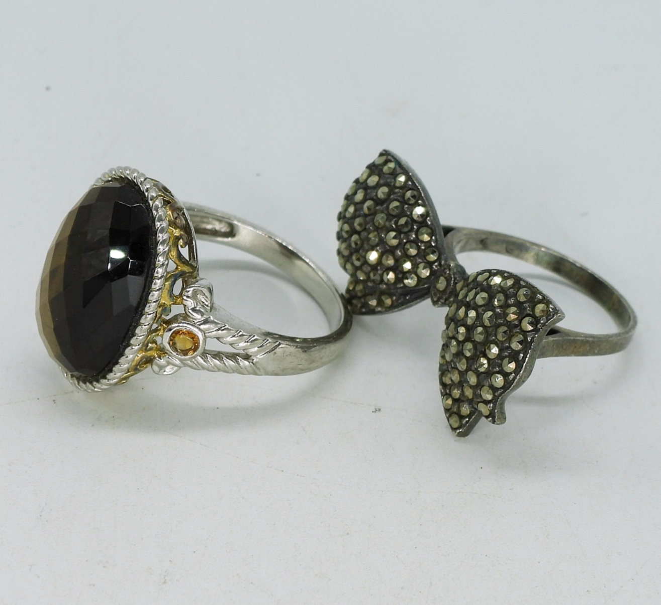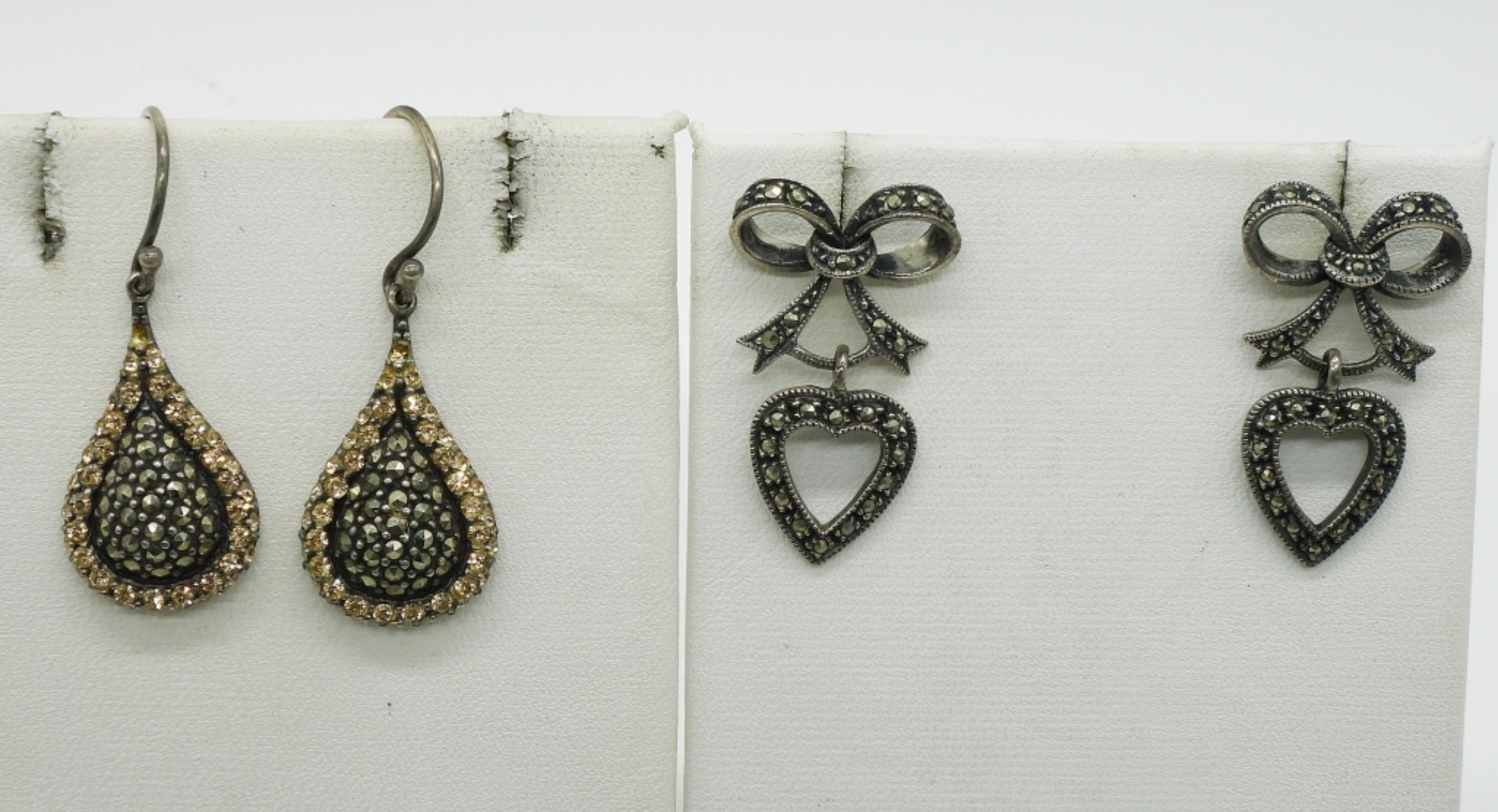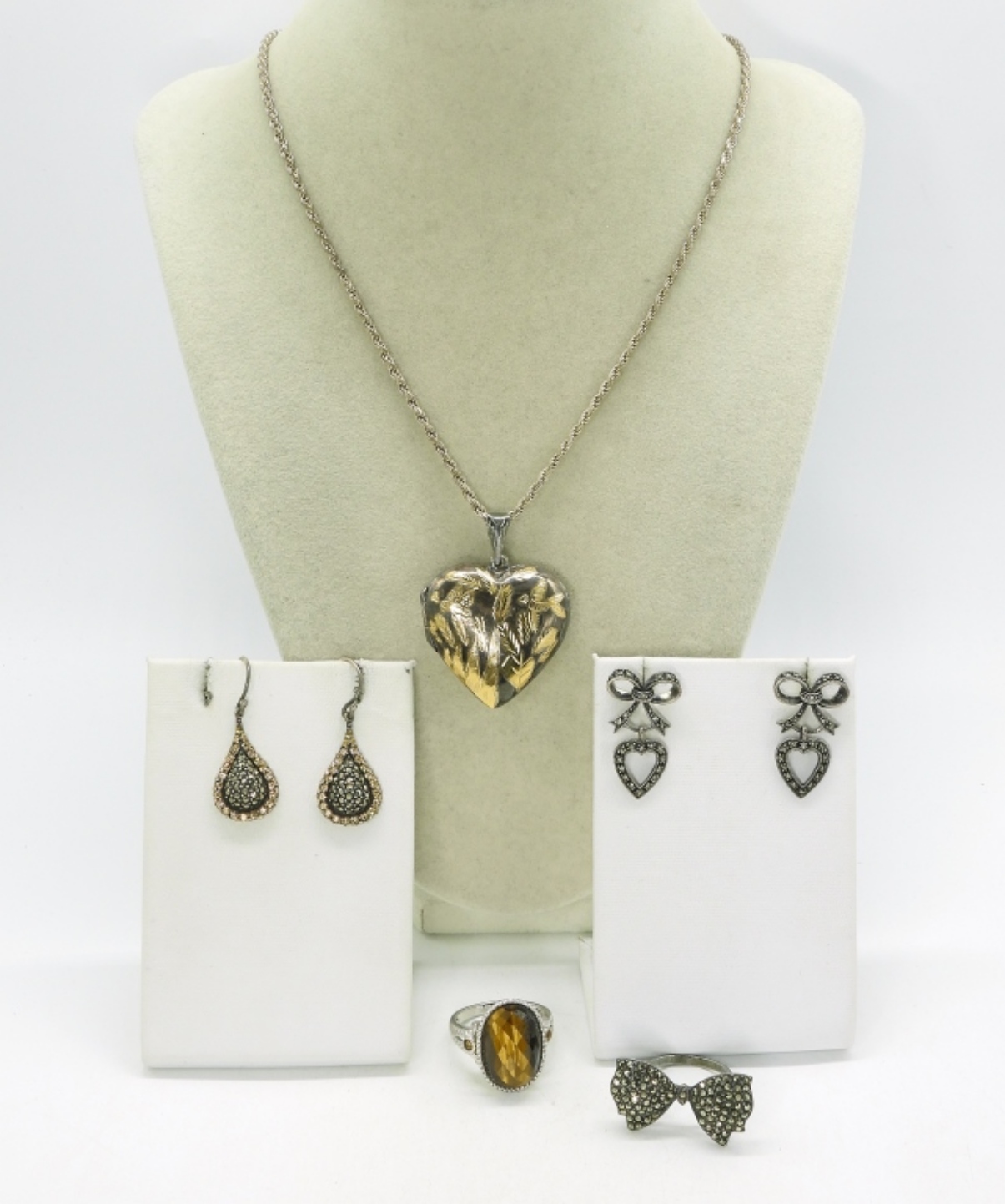 Two sterling rings, Marcasite & Faceted tigers eye. Sizes 7 & 10. Two pair of pierced earrings. Sterling & Gold Tone Heart pendant on a 18″ chain. (26 dwt)
