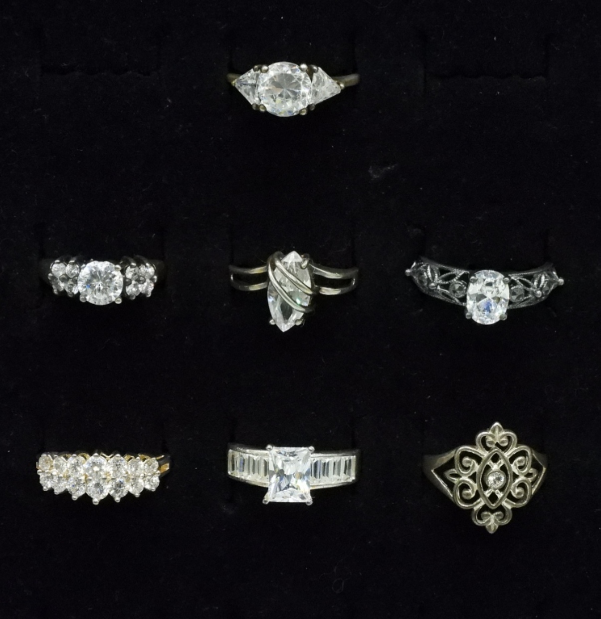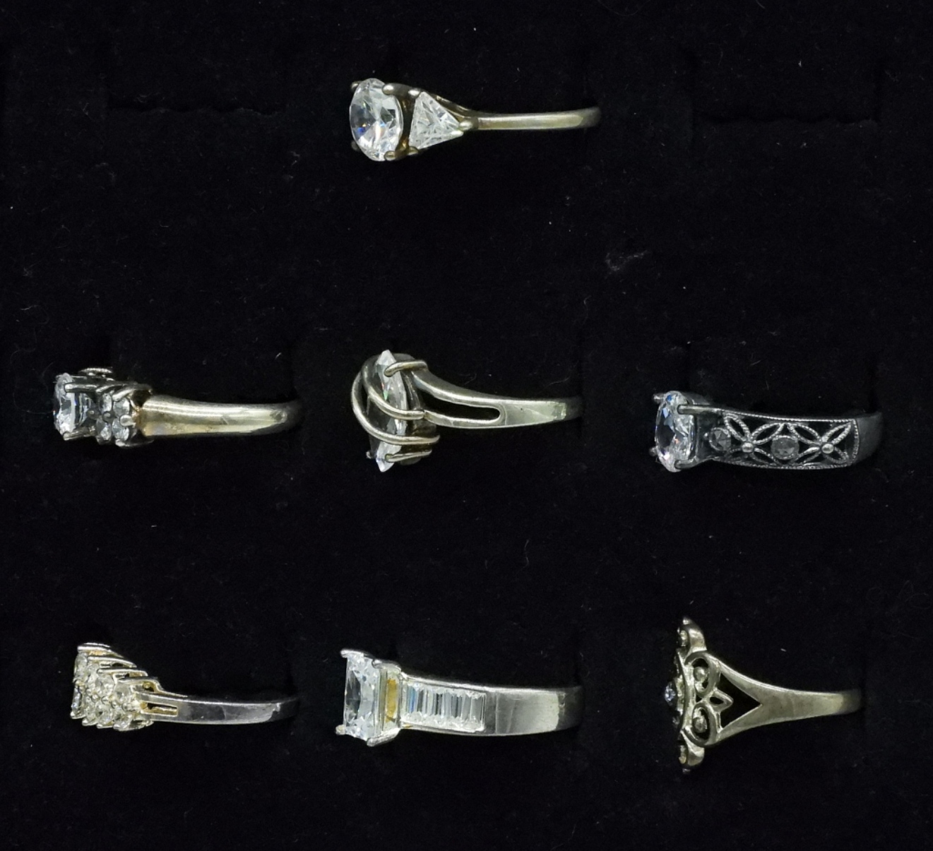 Seven sterling bridal style rings. Sizes 6-8 (15.5 dwt)