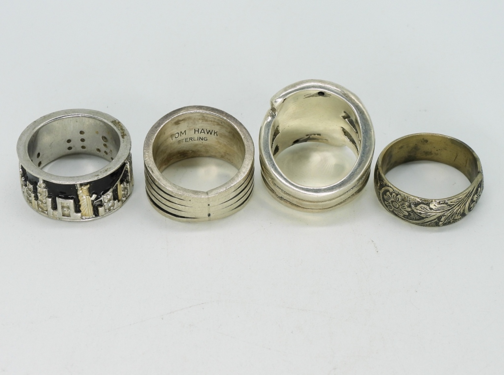 Four sterling rings, sizes 8, 9, 10. Etched floral, city scape and puffed sterling. (22.9 dwt)