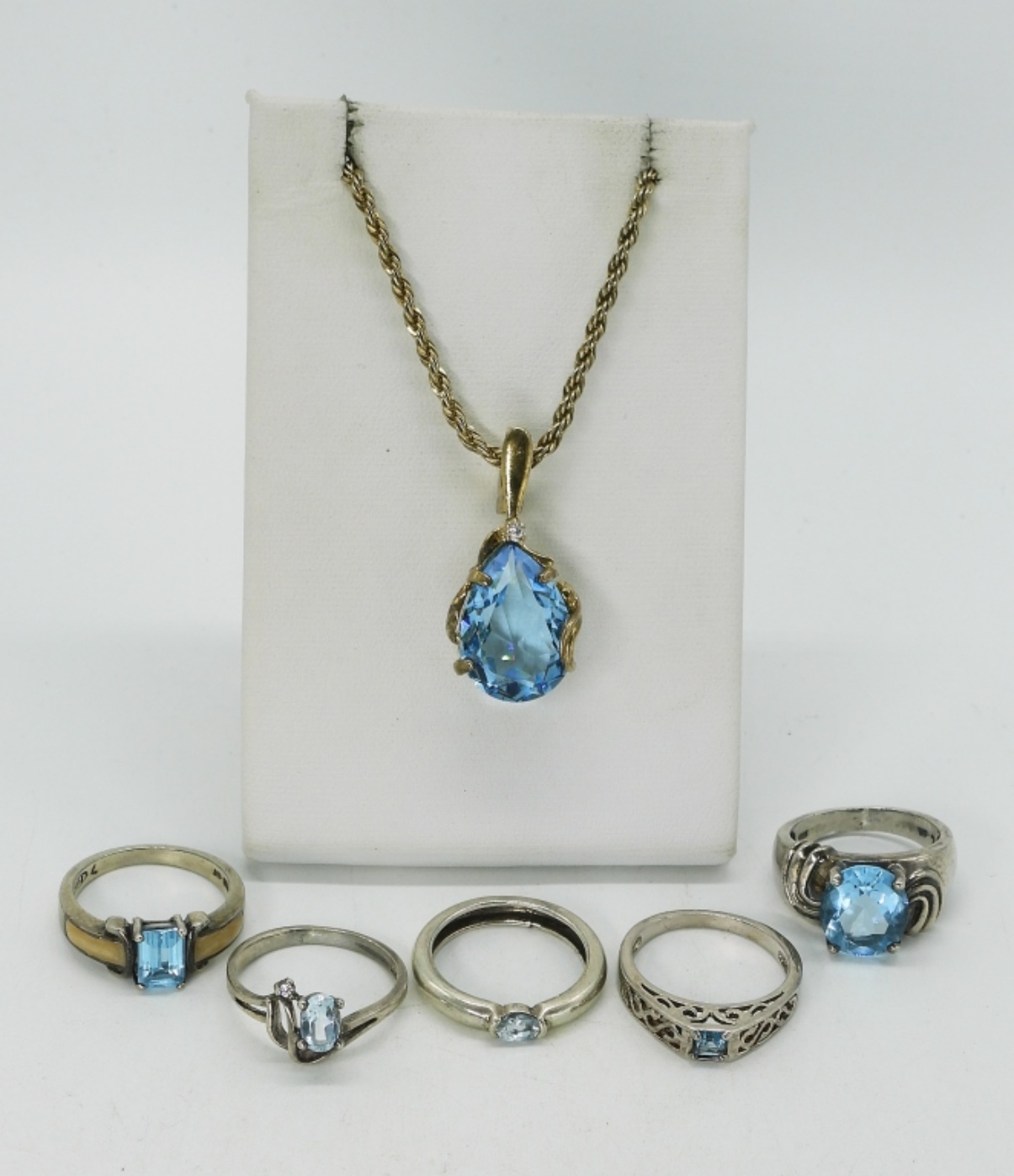 Five sterling blue topaz rings, size 7. Blue topaz pendant in gold tone sterling, chain is 18″. (19 dwt)